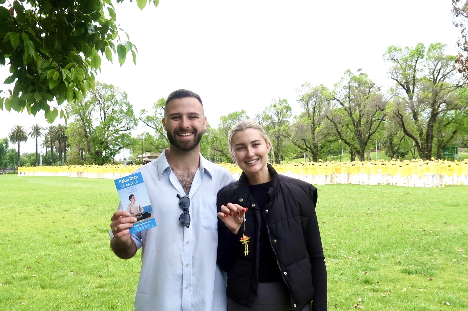大卫·穆里(David Murry)和女友丹妮尔·哈利迪(Danielle Halliday)来自西澳洲首府珀斯,当天看到法轮功学员的排字活动,让他们感到“非常积极,非常平和”,穆里说:“排字现场的色彩、平和的气氛,让我们感觉(他们)具有精神信仰(spiritual)。”