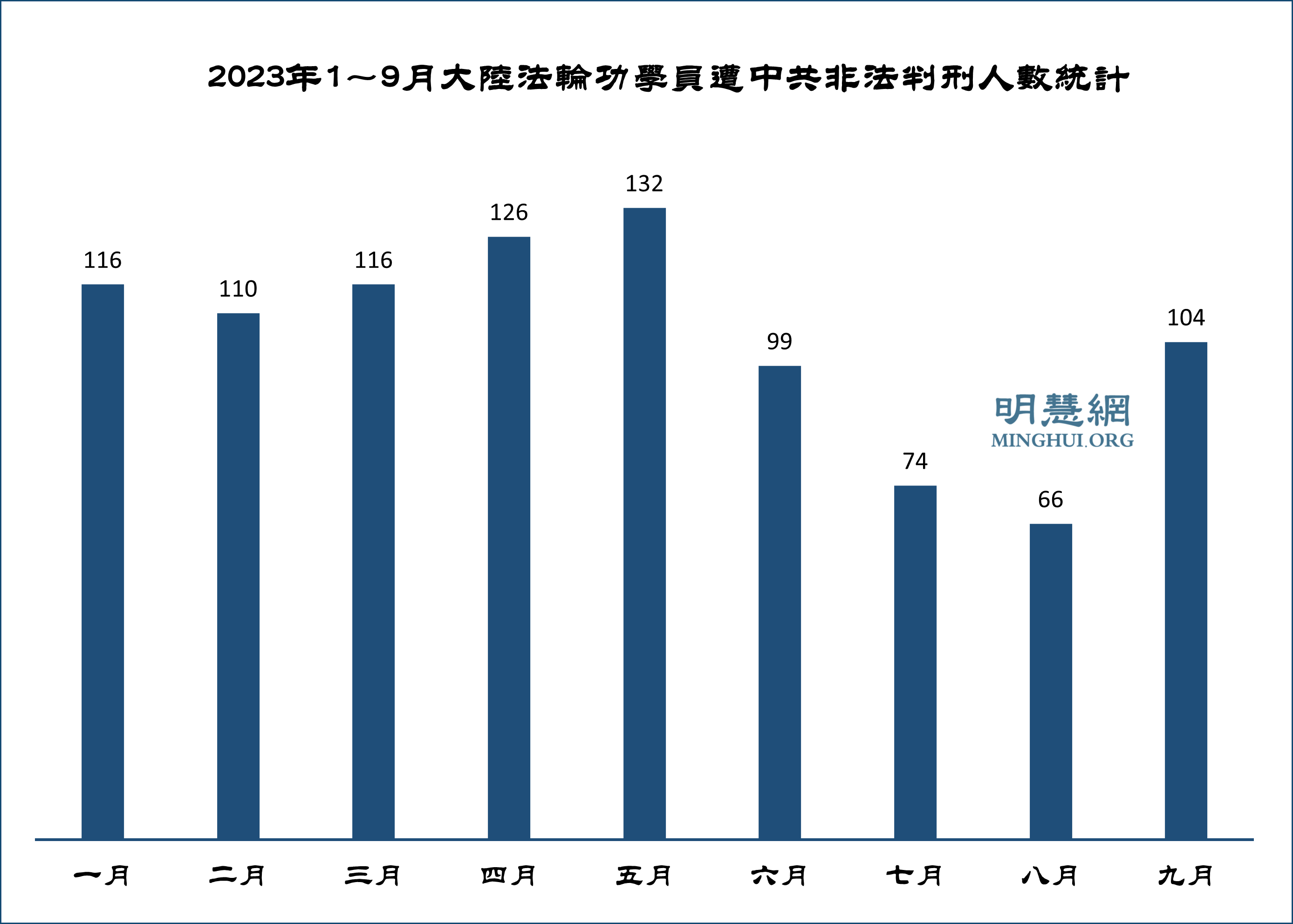 ![]() 图1:2023年1~9月大陆法轮功学员遭中共非法判刑人数统计 |