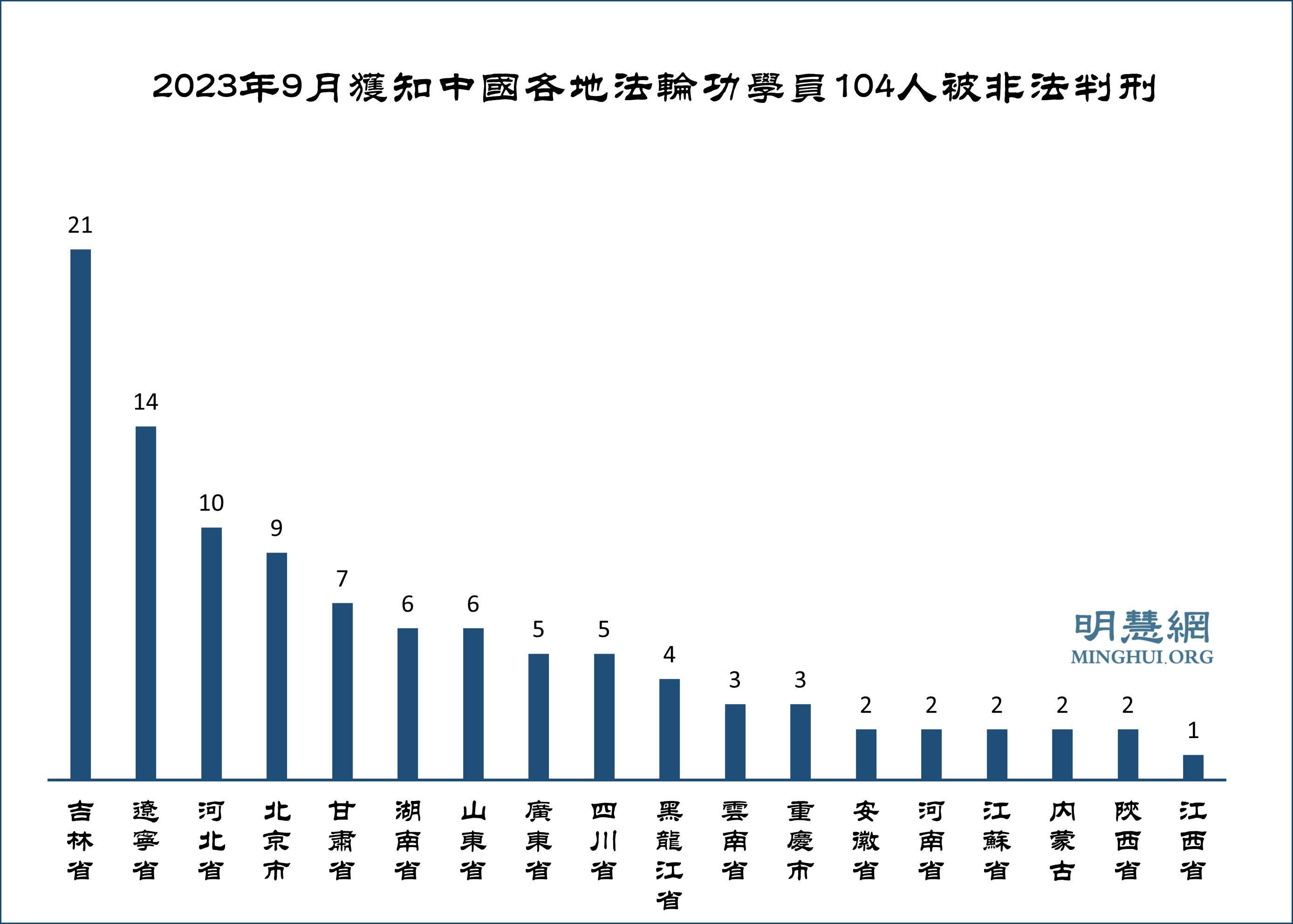 ![]() 图3:2023年9月获知中国各地法轮功学员104人被非法判刑 |