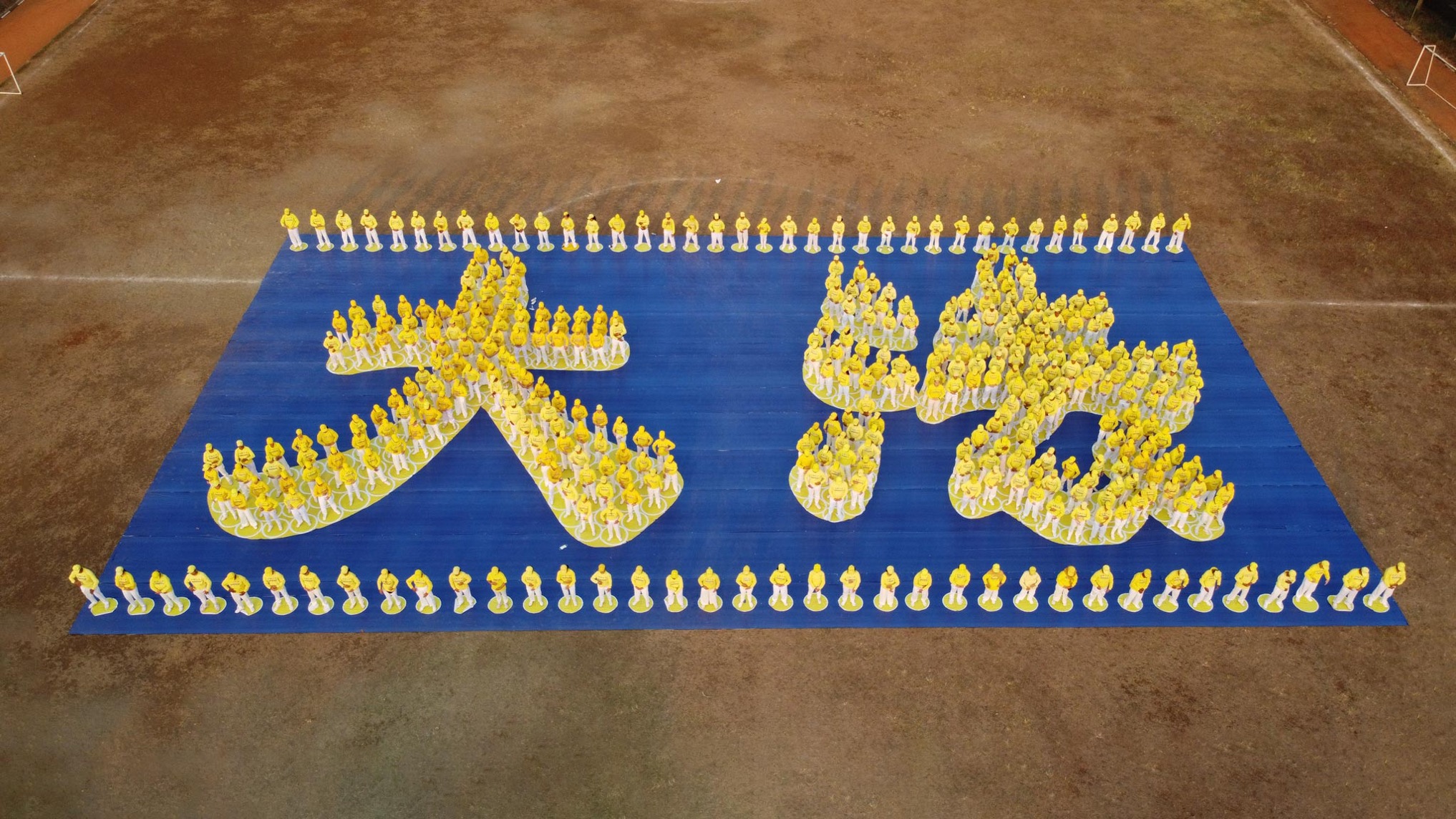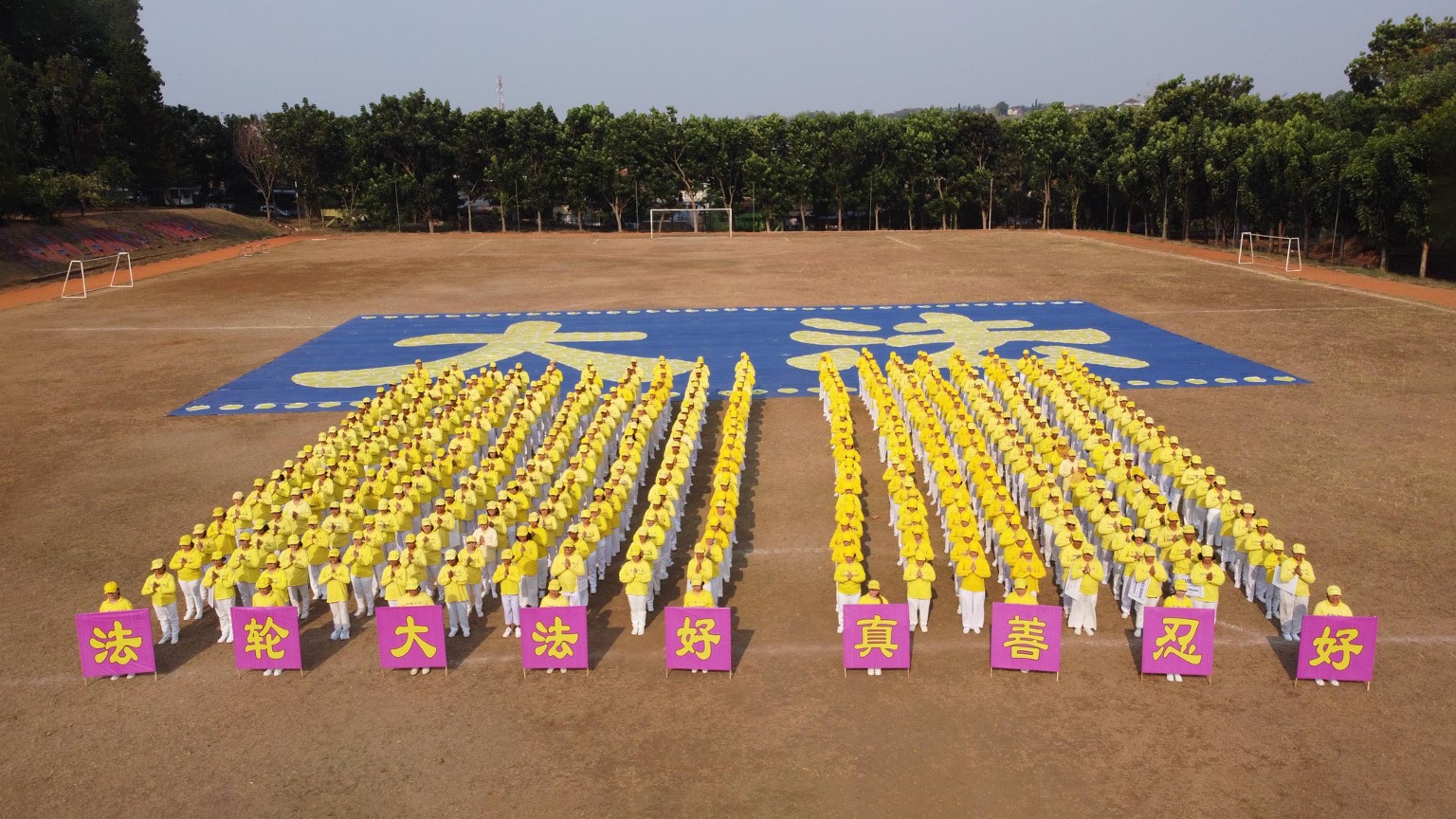 尽管当天天气炎热,但学员们依序入场,安静地站在指定位置,他们身穿黄白相间的服装,排成大法二字,每个字宽十五米,高十五米。一百三十三位学员组成“大”字,二百零一名学员组成“法”字,七十名学员组成文字的上下边框。
