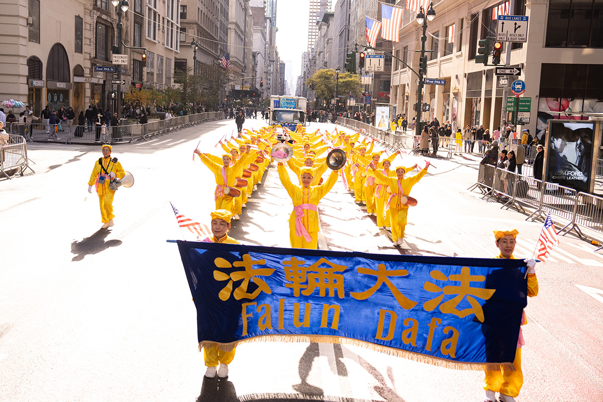 法轮大法团体每年均参加纽约市的退伍军人日游行,向老兵致敬。今年的方阵包括天国乐团、炼功队、彩旗队、花船队、莲花舞蹈队、腰鼓队、LED车等,队伍整齐、神采奕奕、多姿多彩,充满文化内涵,令人赏心悦目,向各界民众送上法轮大法的祝福,带去真、善、忍的美好,带去纯正的能量,也为游行增添光彩。