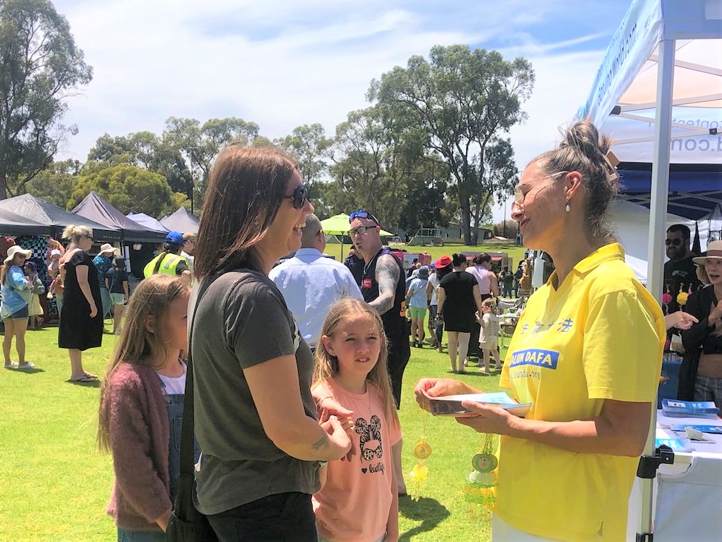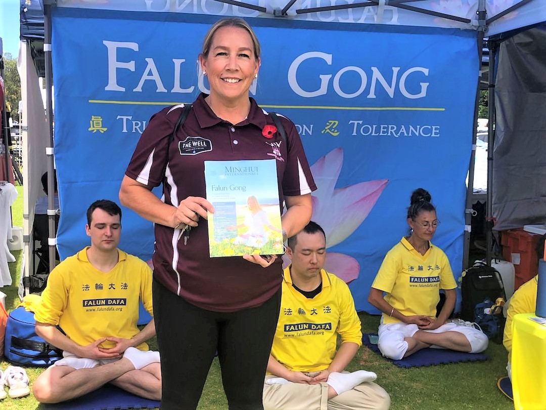 社区支持工作者凯莉·莫里斯(Kylie Morris)表示喜爱法轮功学员的展位,并被展位和学员的着装所吸引,她说:“我喜欢(大法)的黄色,这里是如此平和,我需要这些,在生活中我需要更多的祥和与平衡。是的,我想修炼法轮大法。”