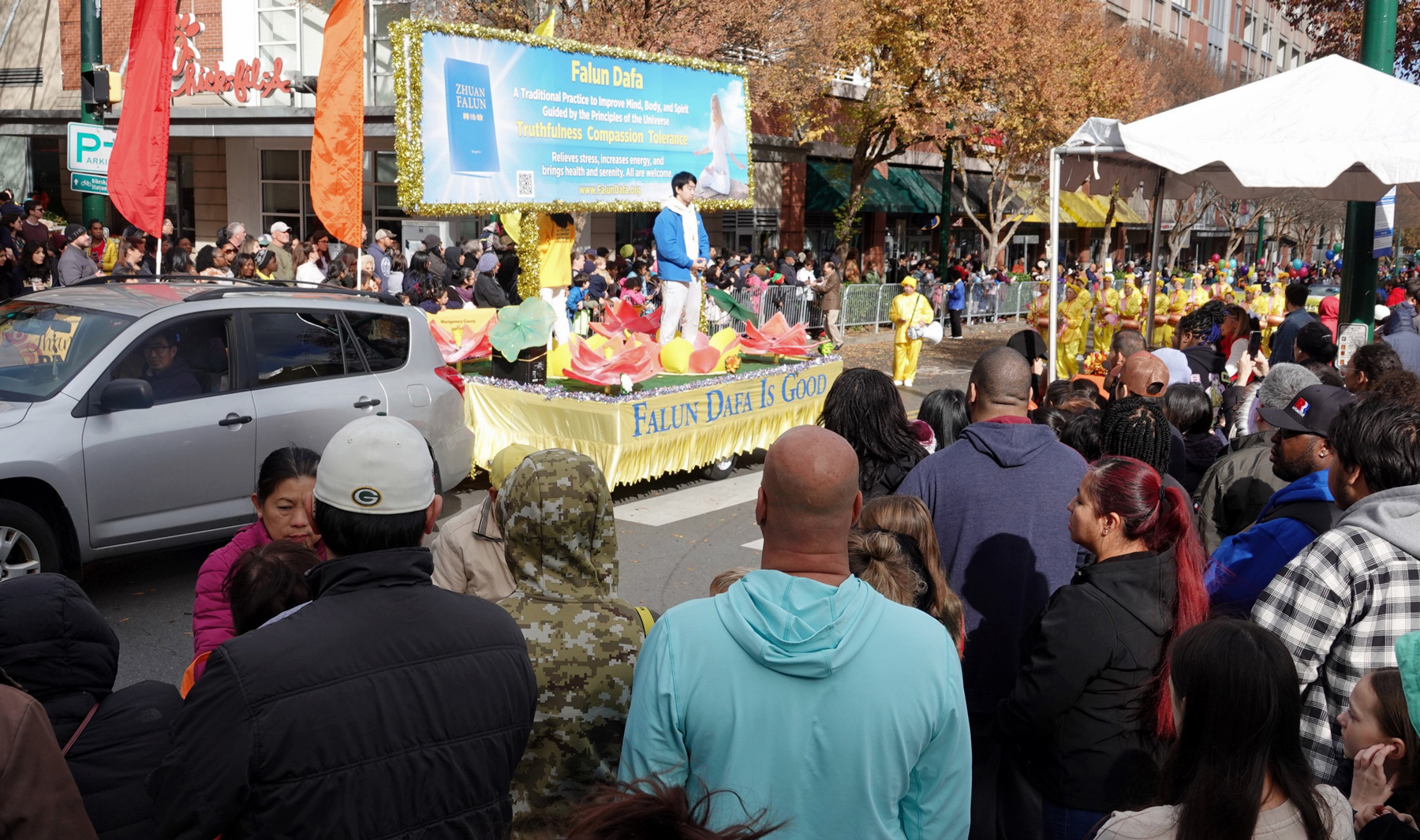 法轮功学员游行队伍包括花车和腰鼓队,两位青年法轮功学员在花车上演示功法。腰鼓队带给民众平和与喜庆,人们伴随着音乐和鼓点为他们鼓掌喝彩。写有中英文的“法轮大法”、“世界需要真善忍”的横幅所传递的信息受到沿途民众的欢迎,他们争相接过法轮功学员递上的传单。