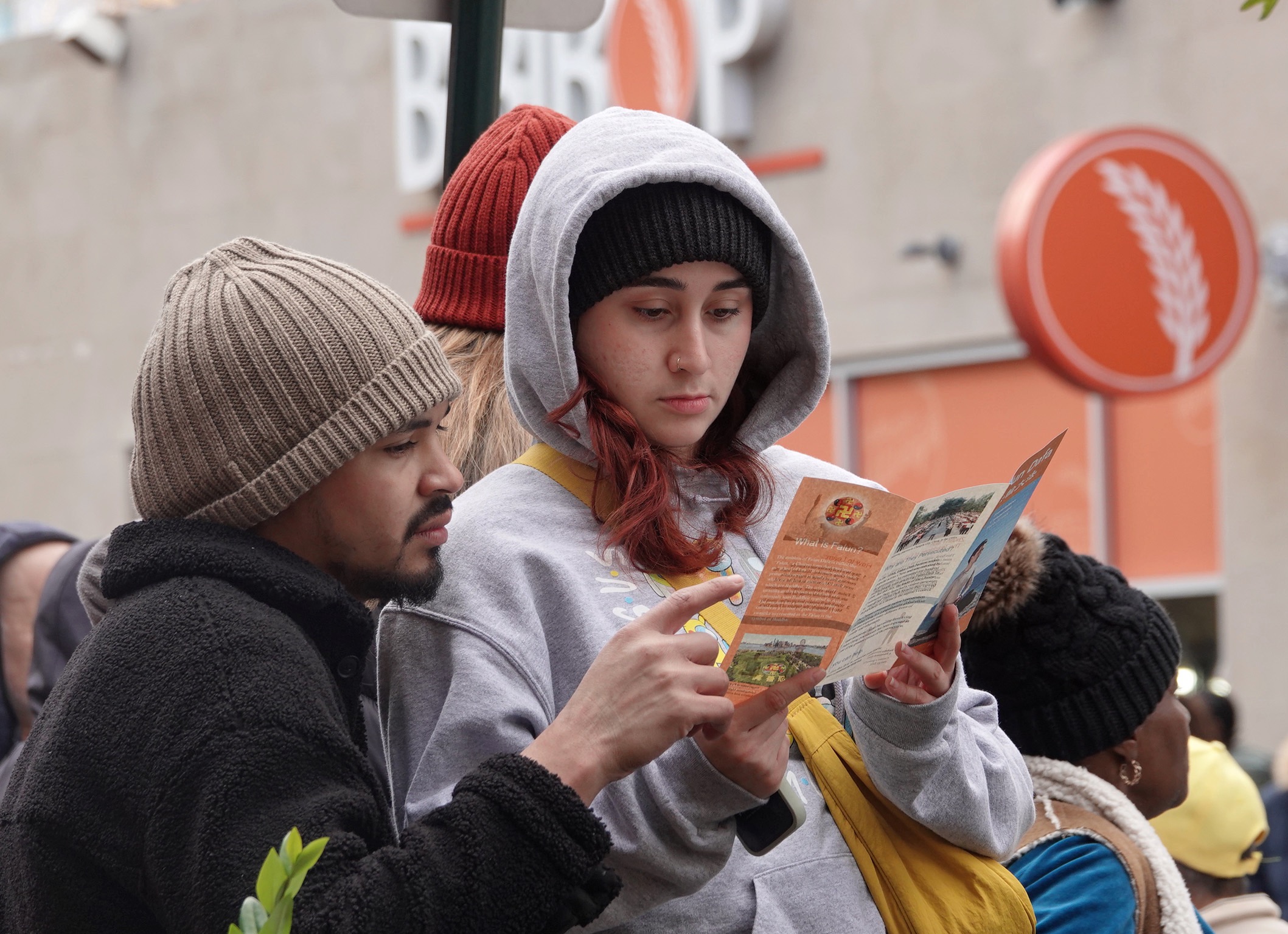 罗莎的手里拿着法轮大法真相传单。她说:“真、善、忍真的非常重要,我们都应该牢记在心。”