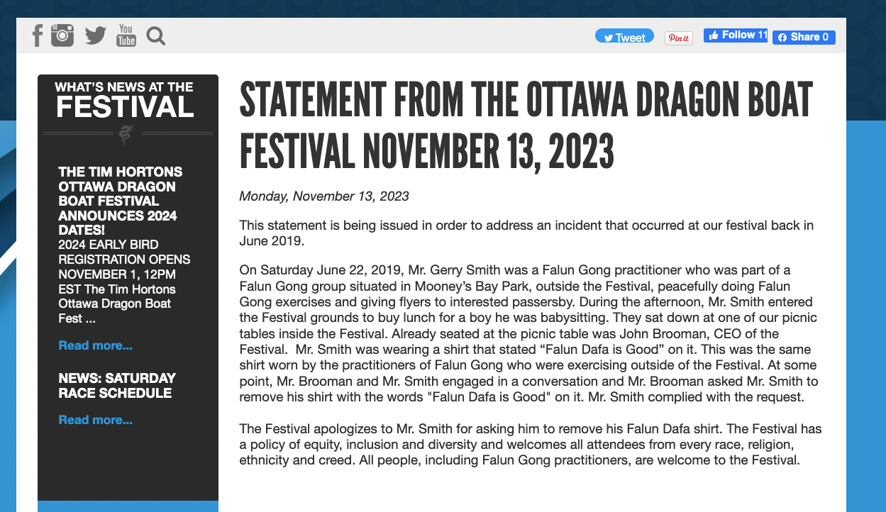 二零二三年十一月十三日,加拿大渥太华龙舟节主办方(Ottawa Dragon Boat Foundation)在其网站上发布声明,向在二零一九年的龙舟节中发生的,史密斯先生被要求脱下印有‘法轮大法好’的衬衫,表示道歉。