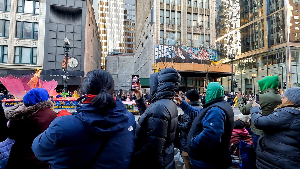 图7:二零二三年十一月二十三日,在芝加哥感恩节大游行中,非常多的观众用手机拍照、录像,记录法轮功游行。