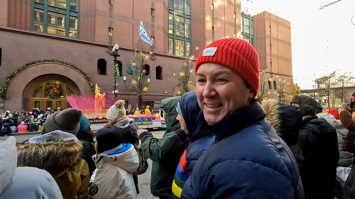 图9:二零二三年十一月二十三日,迈克(Mike)在芝加哥感恩节游行中给法轮功学员方阵拍照。
