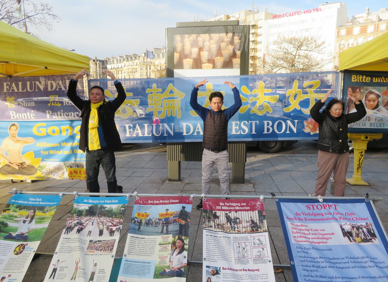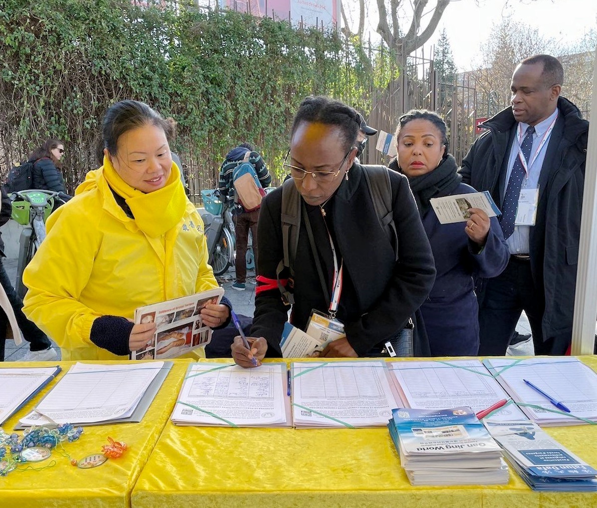 展览会外的入口处,法轮功学员设置了信息台,向人们分发真相资料、展示法轮功功法、征集签名反迫害