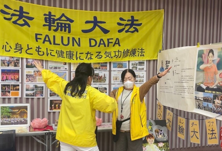 大阪北区区民中心自二零一零年,一直为法轮功学员提供免费教功的教室,有很多日本人都在此学炼或体验过法轮功。当天一早就有民众来到法轮功的展位,有认真看真相展板的,有很多人到大法展位询问法轮功的相关信息。