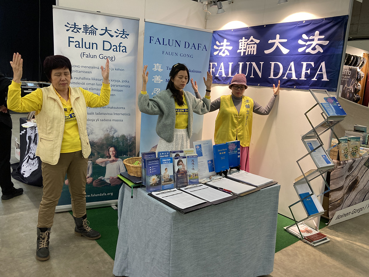 ![]() 图2:法轮功学员在赫尔辛基书展上设立展位,学员在展位中展示法轮功功法。 |