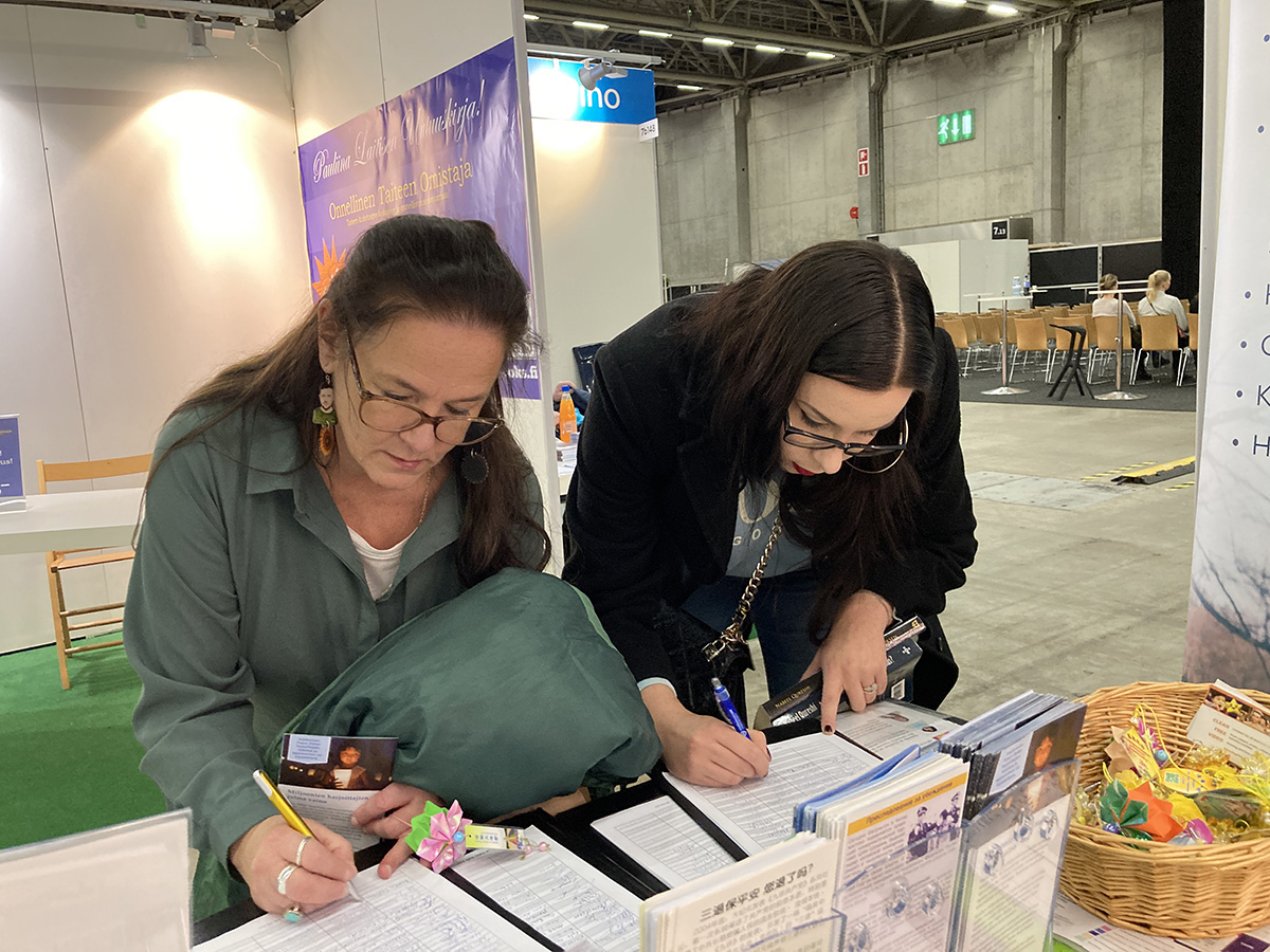 ![]() 图4:歌手琳达(Linda)和母亲瑞塔(Riitta)签名支持法轮功反迫害。 |