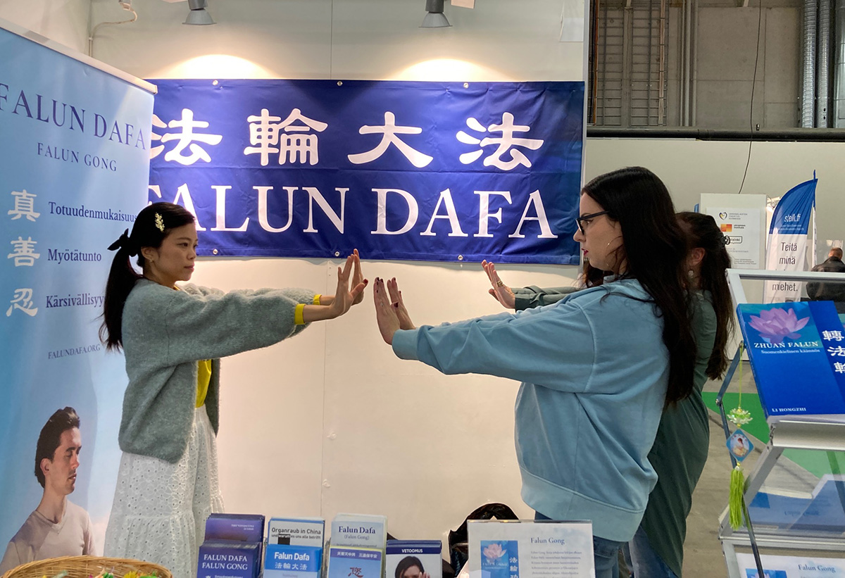 歌手琳达(Linda)和母亲瑞塔(Riitta)路过法轮大法的展位。这对母女住在赫尔辛基市中心附近,经常遇见学员在那里传播真相,瑞塔说几年前她签过名支持法轮功学员反迫害。她们表示对法轮功功法非常感兴趣,现场跟学员学炼了起来。琳达欣喜的说:“我全身发热,感觉非常舒服。”她还说:“因为妈妈要照顾年迈的奶奶,压力很大,这个很适合妈妈学。”展会最后一天,琳达又找了一点时间到法轮功的展位继续学习功法。