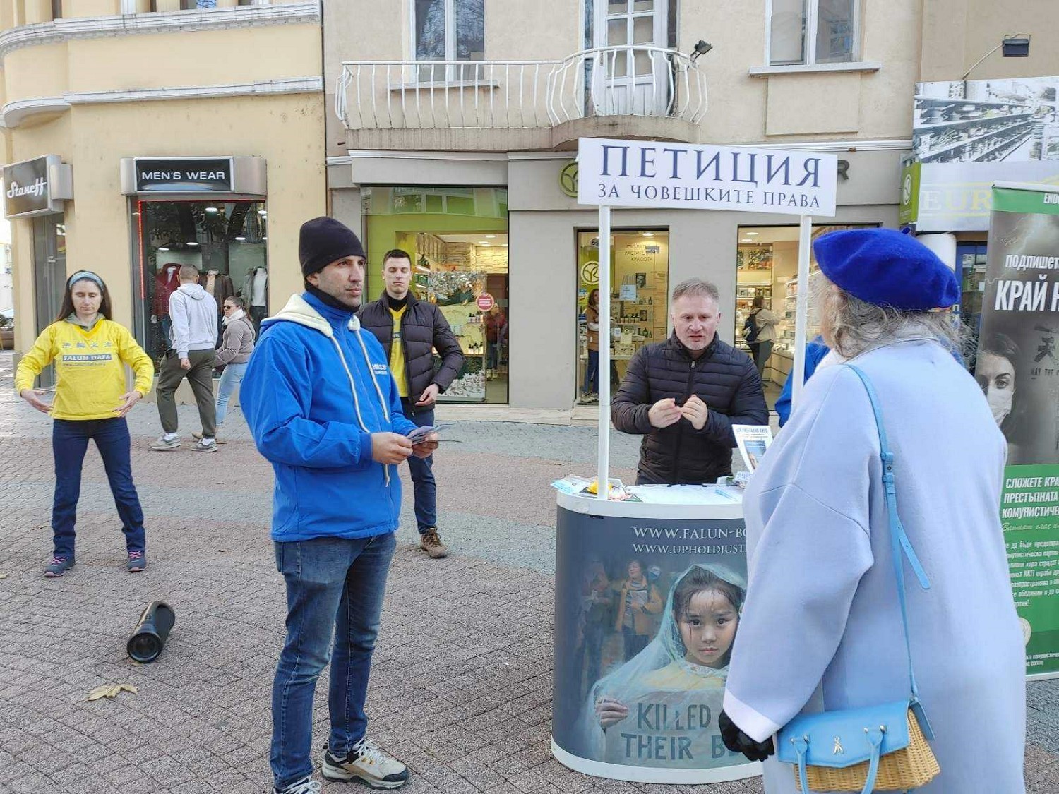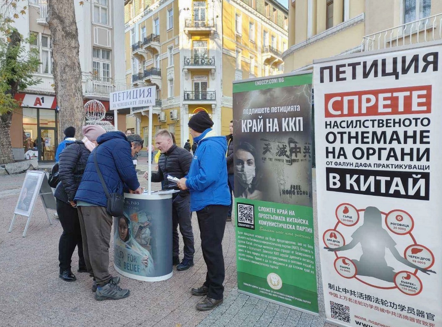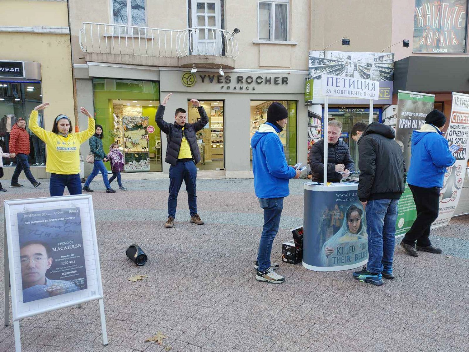 十二月九日星期六,法轮功学员再次来到他们平时讲真相的地点——普罗夫迪夫主要街道,举行和平请愿活动,为两份请愿书征签:一份谴责中共犯下的诸多侵犯人权暴行;另一份呼吁保加利亚政府全面阻止保加利亚人参与中共活摘法轮功学员器官的罪行。