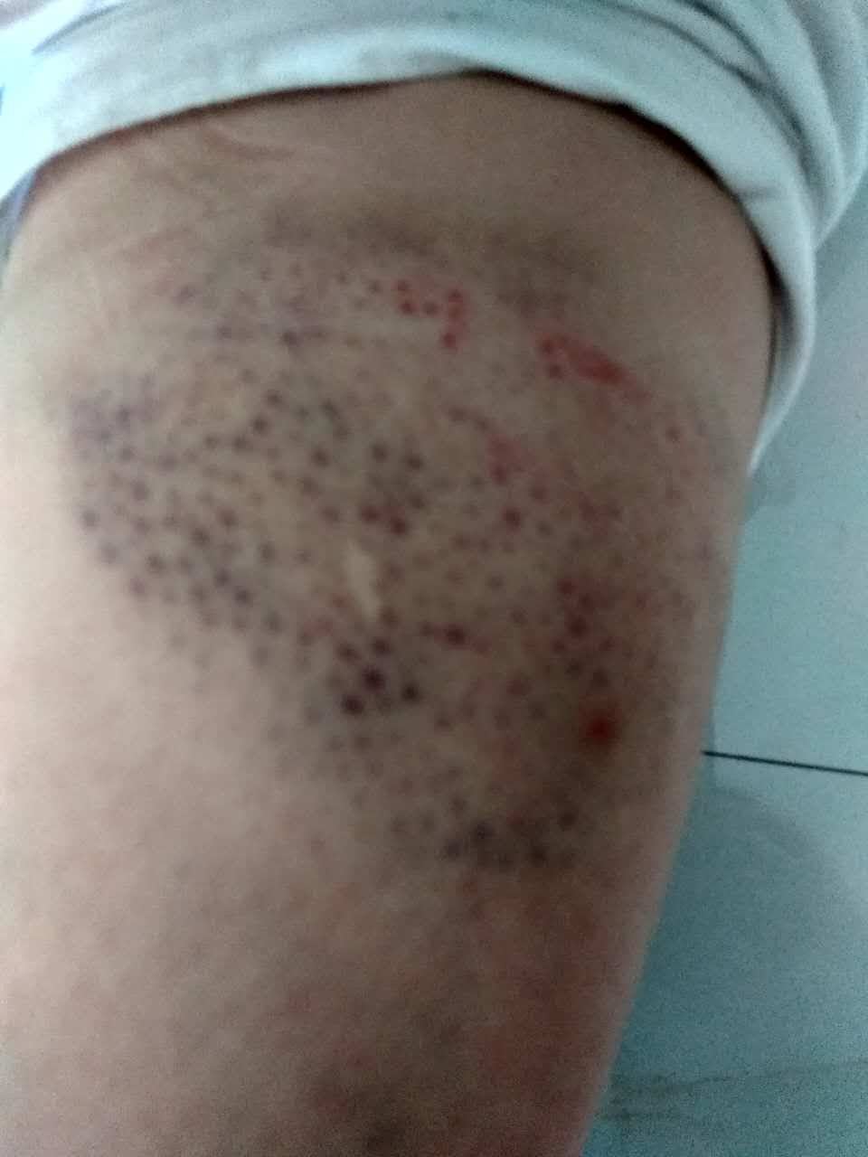 后来,张京琼闯出看守所,她的额头、手臂、大腿、背部受伤严重(见照片为证)。另外,警察的殴打也造成张京琼的内伤,她回到家,骨头、内脏也感觉很痛,手臂都抬不起来。