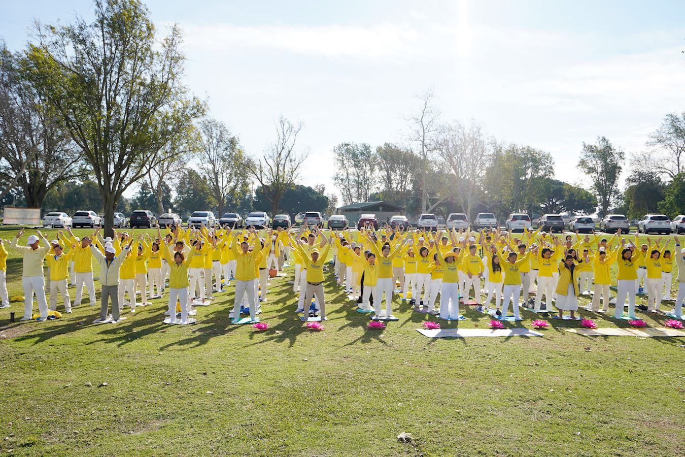 图1:二零二三年十二月十七日,洛杉矶地区法轮功学员在橙县喷泉谷市(Fountain Valley)英里广场公园(Mile Square Park)向师尊李洪志先生恭祝新年好。
