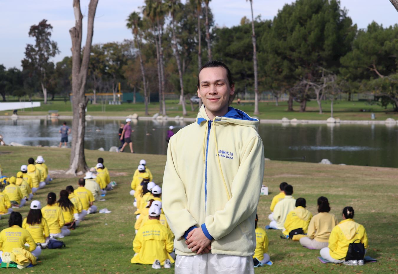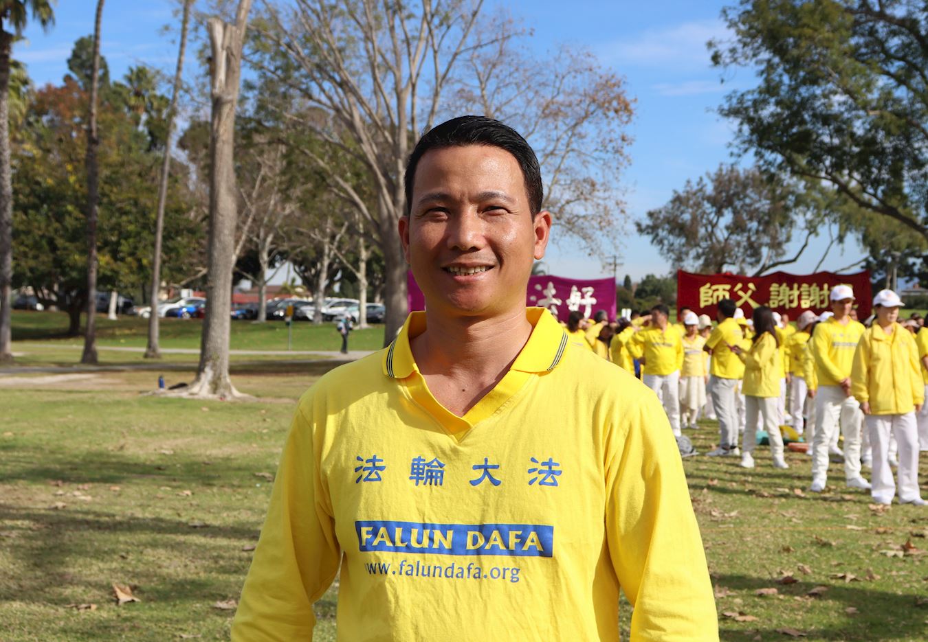 越南裔学员范坚(Kien Pham,音译)在餐馆工作,每天都要站立行走很长时间,而且越到节假日越忙,导致他多年来跟腱疼痛、走路困难。“炼功后我的跟腱不再疼痛,完全康复了;以前我的脊椎不直,也奇迹般地变直了。”