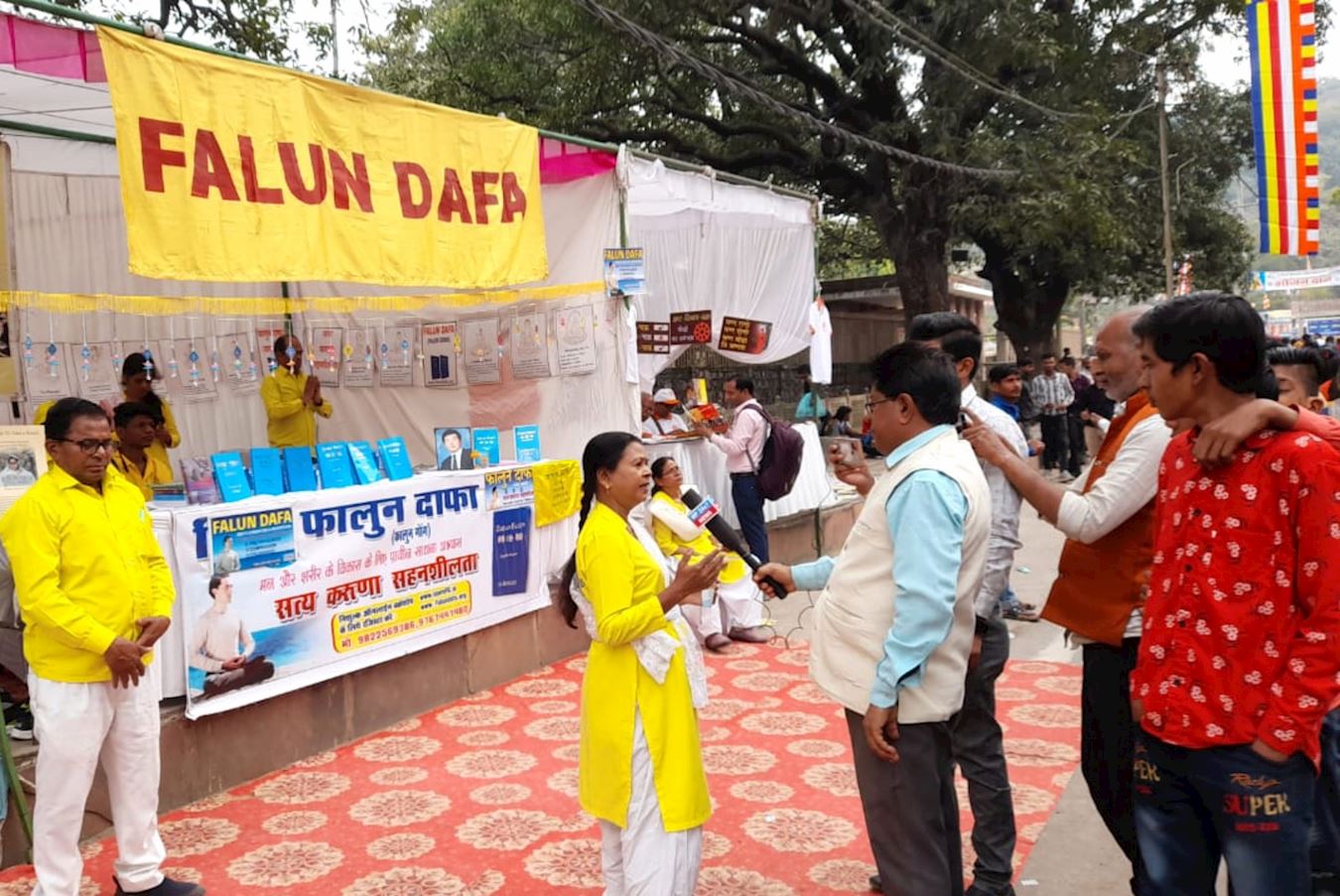 图1~2:法轮功学员在印度桑吉举办的第七十一届摩诃菩提节上,向人们介绍法轮功。