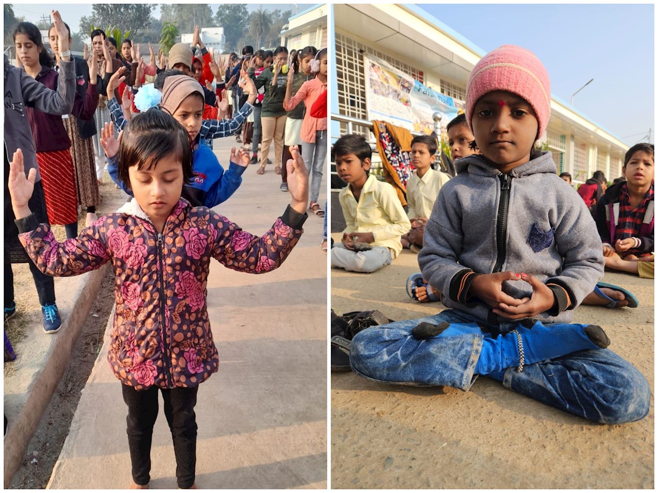 '图10:法轮功学员来到中央邦赖森市的一所公立学校,教学生学炼法轮功。'