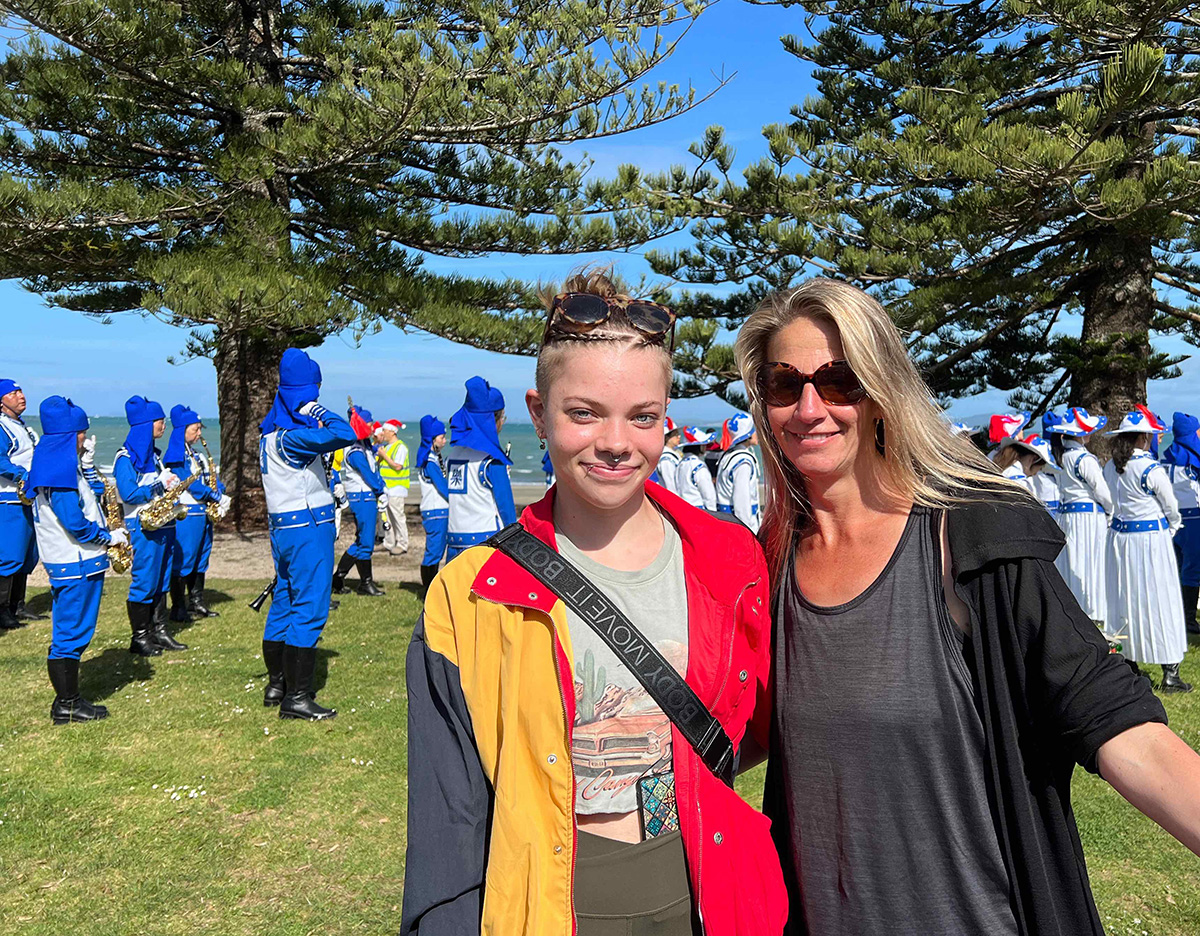 梅兰妮·希姆韦尔(Melanie Shimwell)和她女儿艾米(Amy),还有她孙子一起来观看游行。梅兰妮开心地说,她两岁的孙子非常喜欢天国乐团的音乐,一直在随着音乐摇摆。她还表示非常高兴看到,乐团里不同年龄的成员,有年轻的、有年长的,他们就像一个很棒的社区。