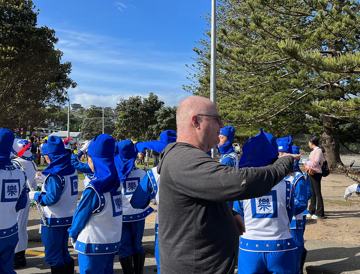 法轮功学员组成的天国乐团,让玛格丽特(Margaret)非常感兴趣,她上前询问:“这是来自哪里的铜管乐队?”并赞叹道:“这也太惊艳了,他们的服装美、音乐美,让人印象深刻!”
