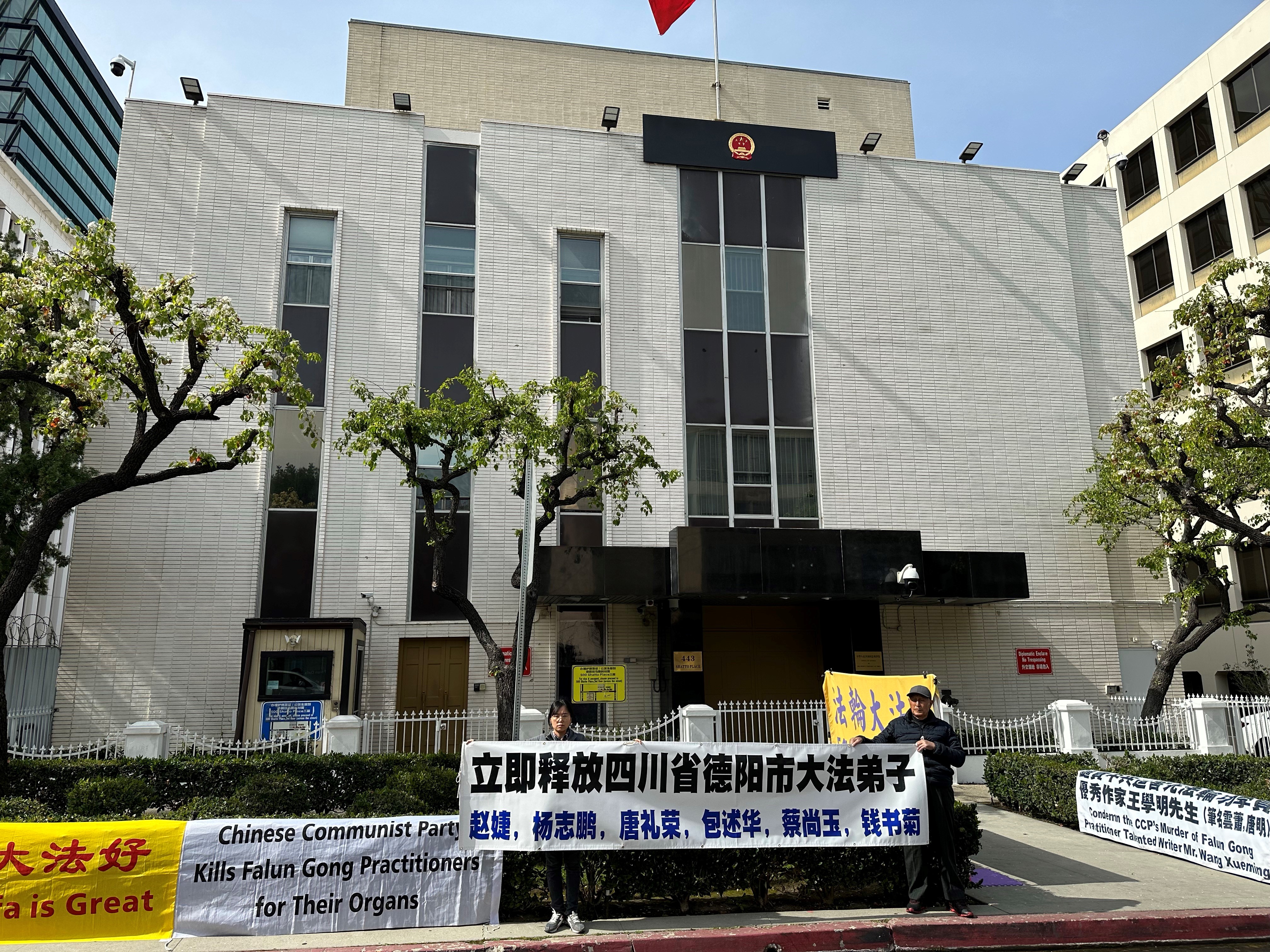 唐礼荣的女儿目前在美国洛杉矶中领馆前抗议中共的非法判刑,要求立即无罪释放她的父亲。