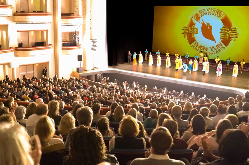 ![]() 图7:二零二三年三月一日晚,美国神韵巡回艺术团在罗克福德的科罗纳多艺术表演中心(Coronado Performing Arts Center)的演出,票房爆满。图为演出结束,演员谢幕。(大纪元) |