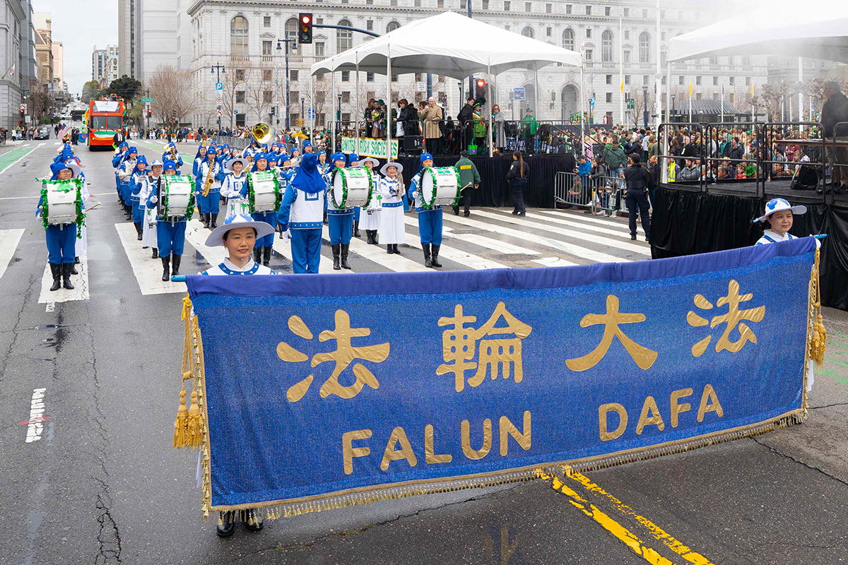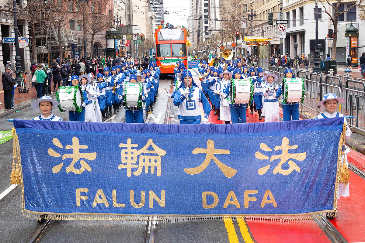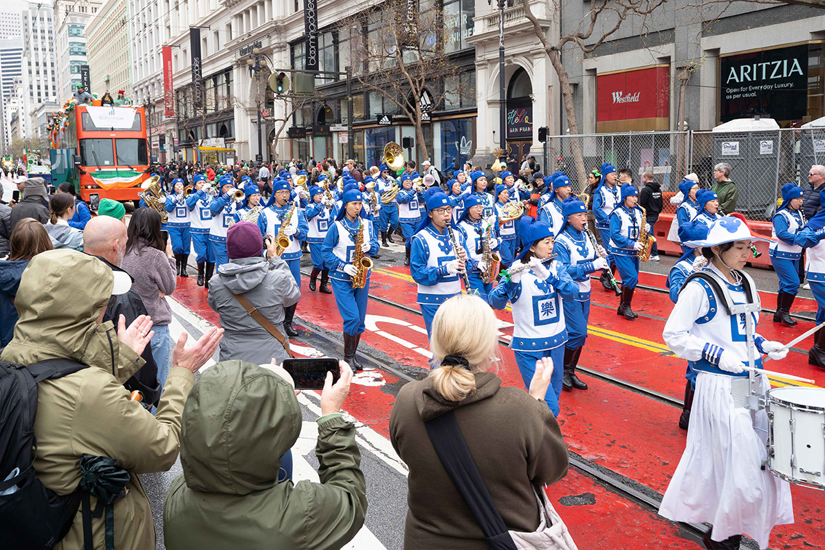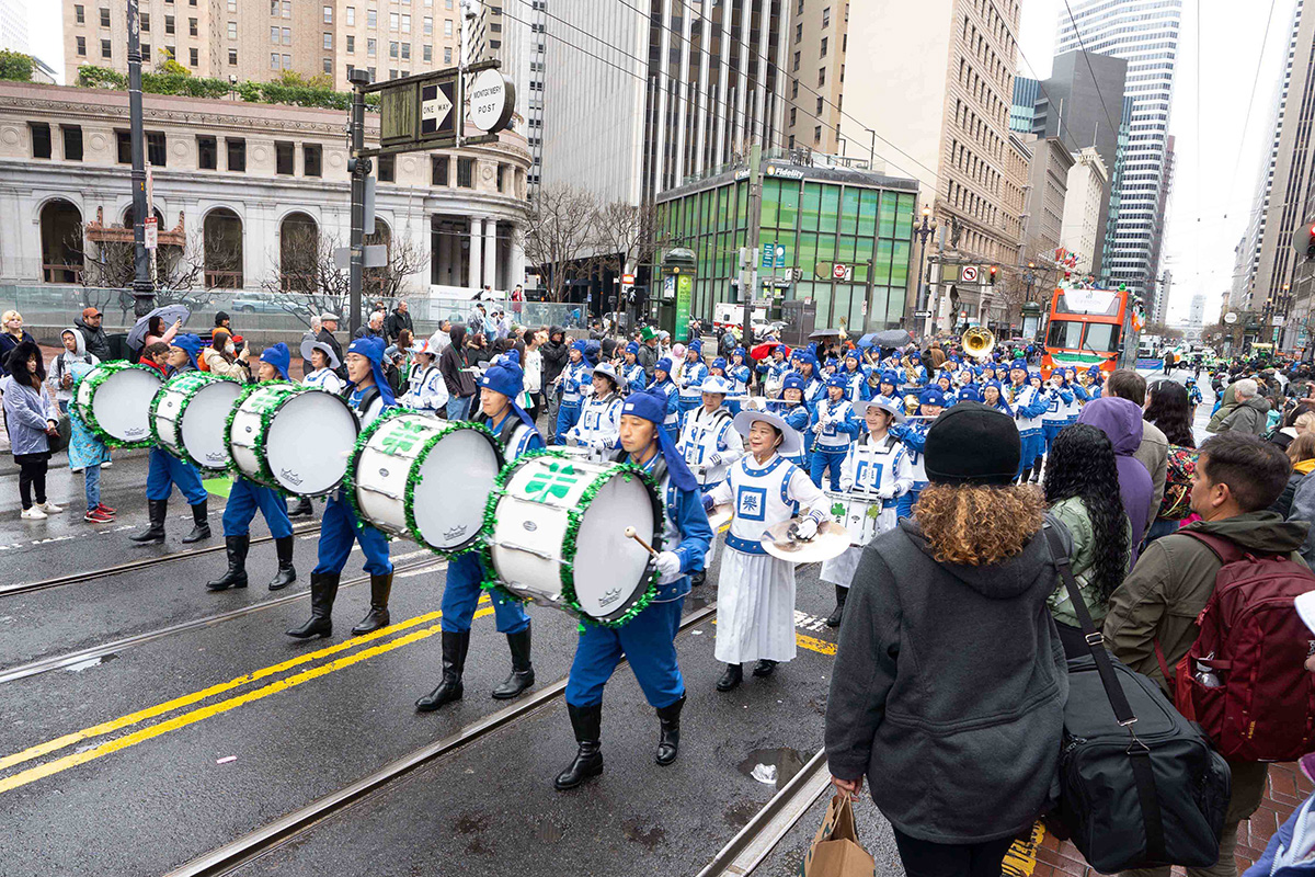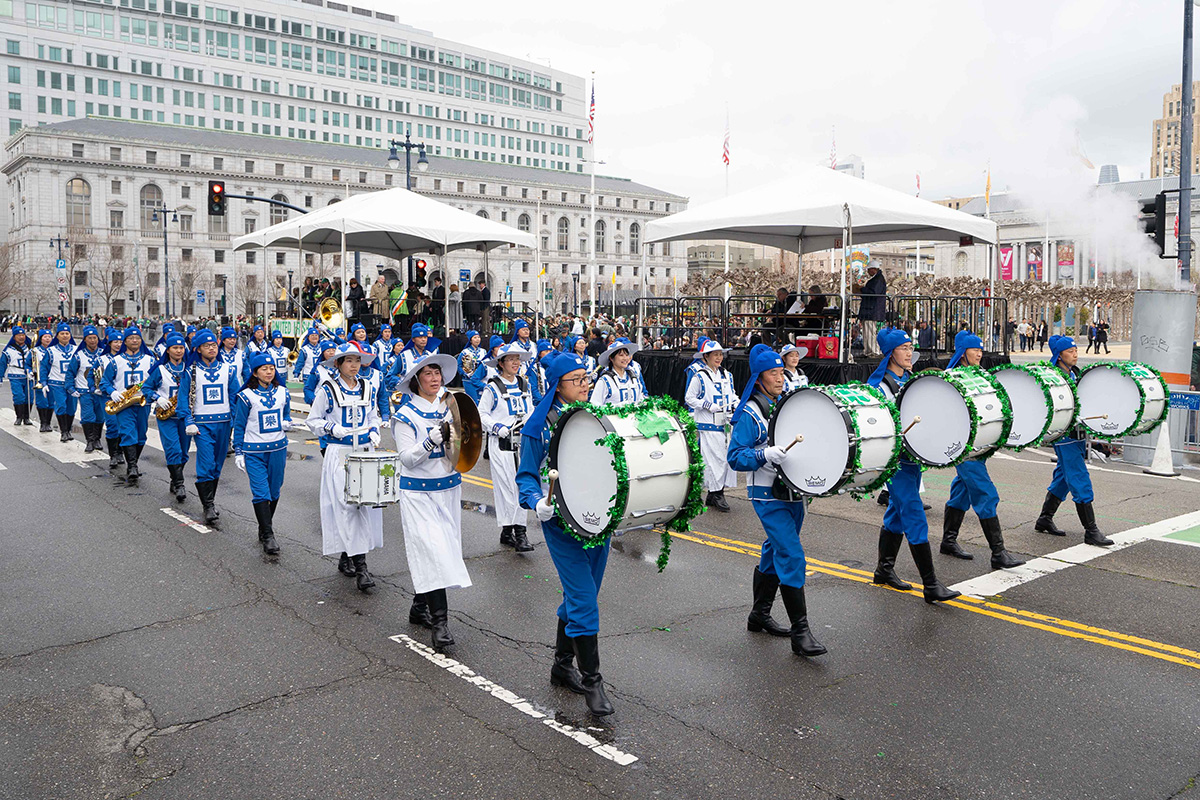 【明慧网二零二三年三月十二日】(明慧记者王英旧金山报道)二零二三年三月十一日上午,由法轮功学员组成的美西天国乐团参加了旧金山第一百七十二届圣派翠克日大游行(St Patrick's Day Parade)。第一次看到法轮功学员队伍的大陆移民说,“很壮观,非常整齐。”