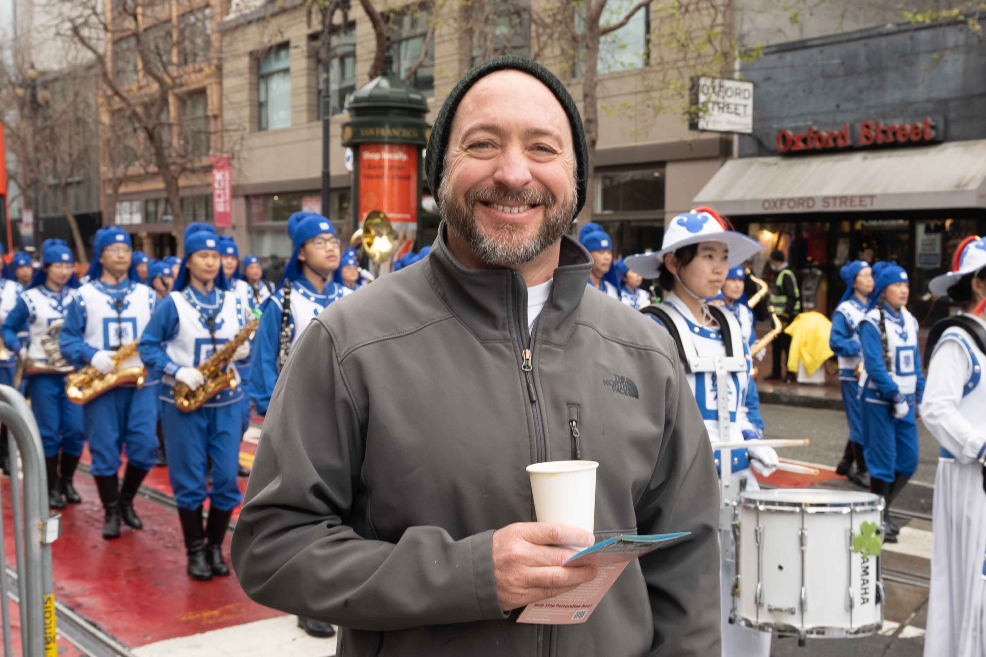 旧金山居民杰克·汉德森(Jake Henderson)和从中国大陆来的女朋友一起观看游行,他表示,法轮功学员的队伍很酷,“他们很棒,看起来很精神,很美,演奏的技巧也很棒,非常整齐,令人振奋。”