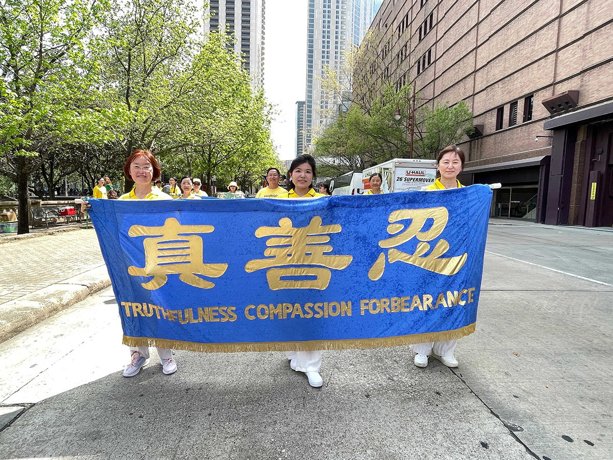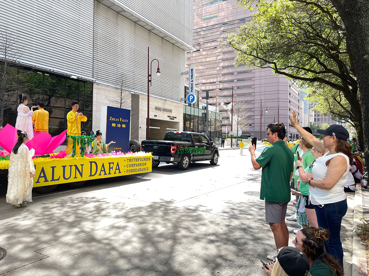 花车在写着“法轮大法好”和“真善忍”的横幅开道下,缓缓的驶过休斯顿市中心的街道。花车所经之处,不时听到赞赏声“太美了”。人们纷纷拿起机拍摄法轮功学员的花车和队伍。还有一些观众跟着花车上演示功法的学员做着炼功动作,脸上洋溢着喜悦和祥和的表情。