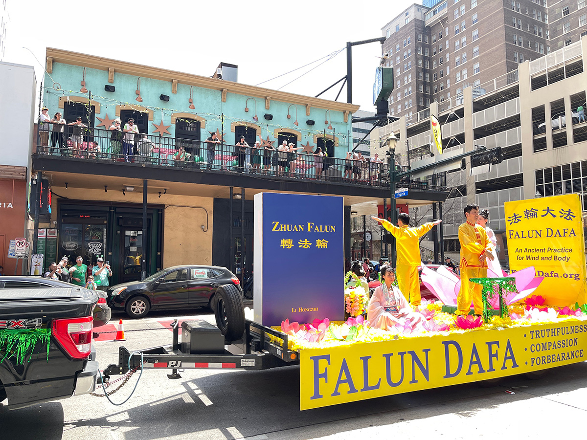 睽违休斯顿市圣派崔克日游行五年,休斯顿法轮功学员制作的花车首次在这个年度游行中亮相。花车上载着巨型英文版《转法轮》书的模型。身着仙女服或传统炼功服的法轮功学员们,或坐或立,展示着舒缓祥和的炼功动作,吸引着民众的目光。