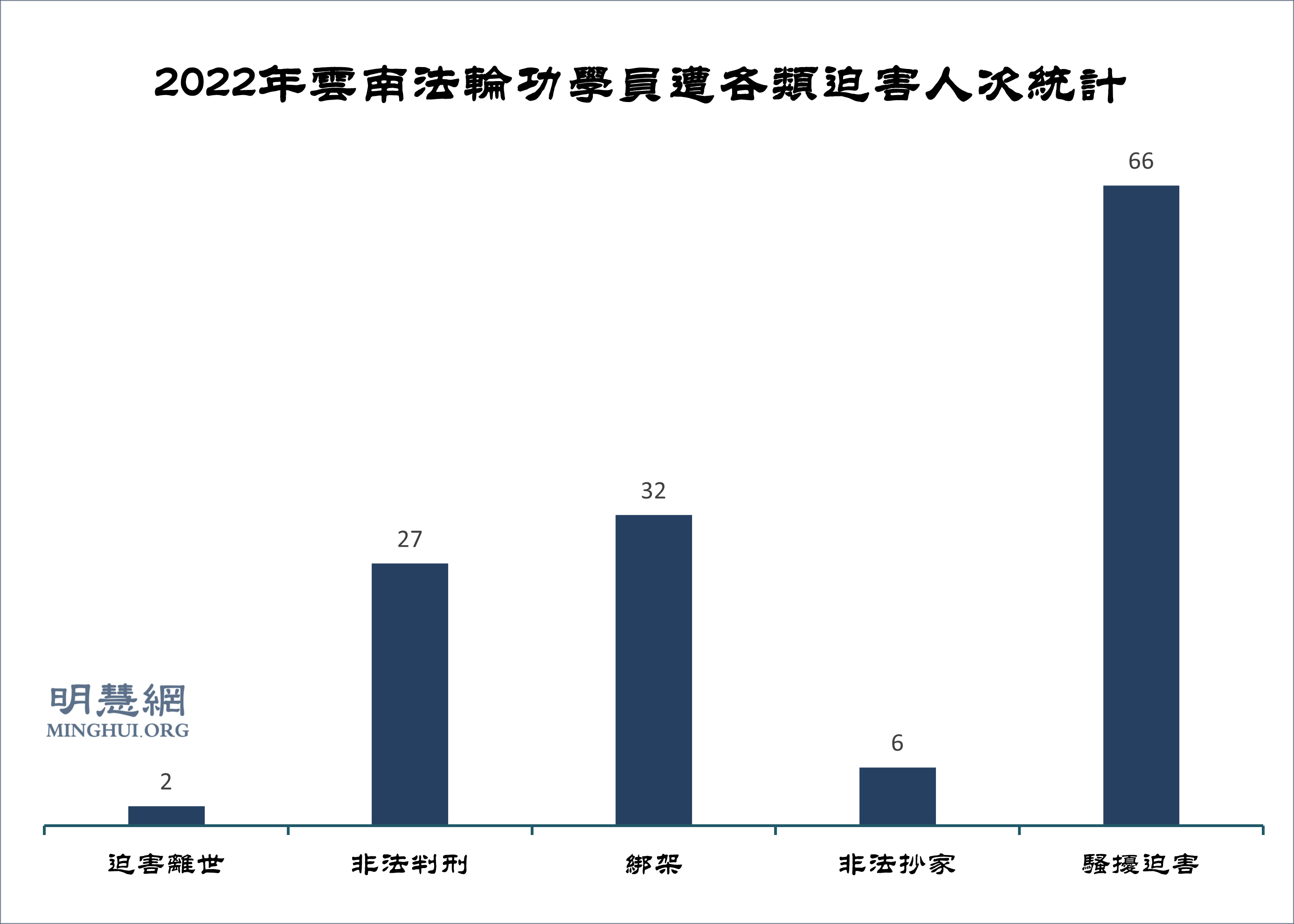 ![]() 图1:2022年云南省法轮功学员遭各类迫害人次统计 |