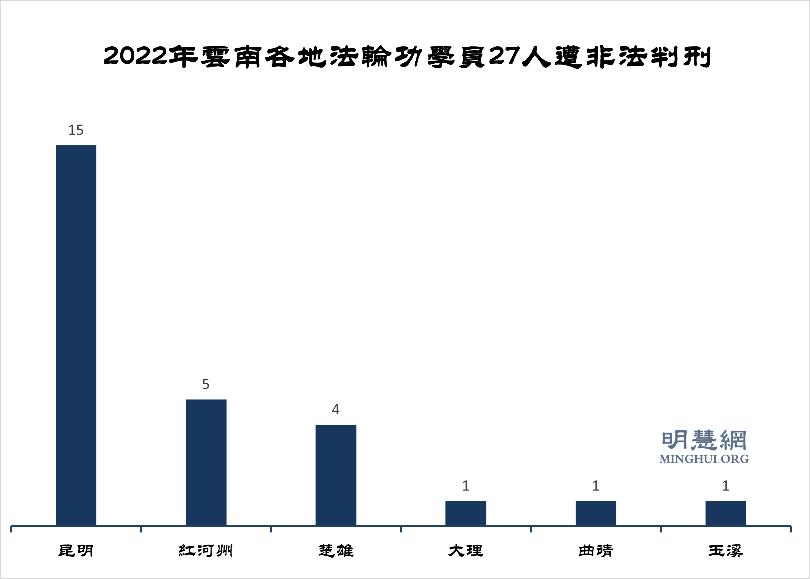 ![]() 图3:2022年云南省各地法轮功学员27人遭非法判刑 |