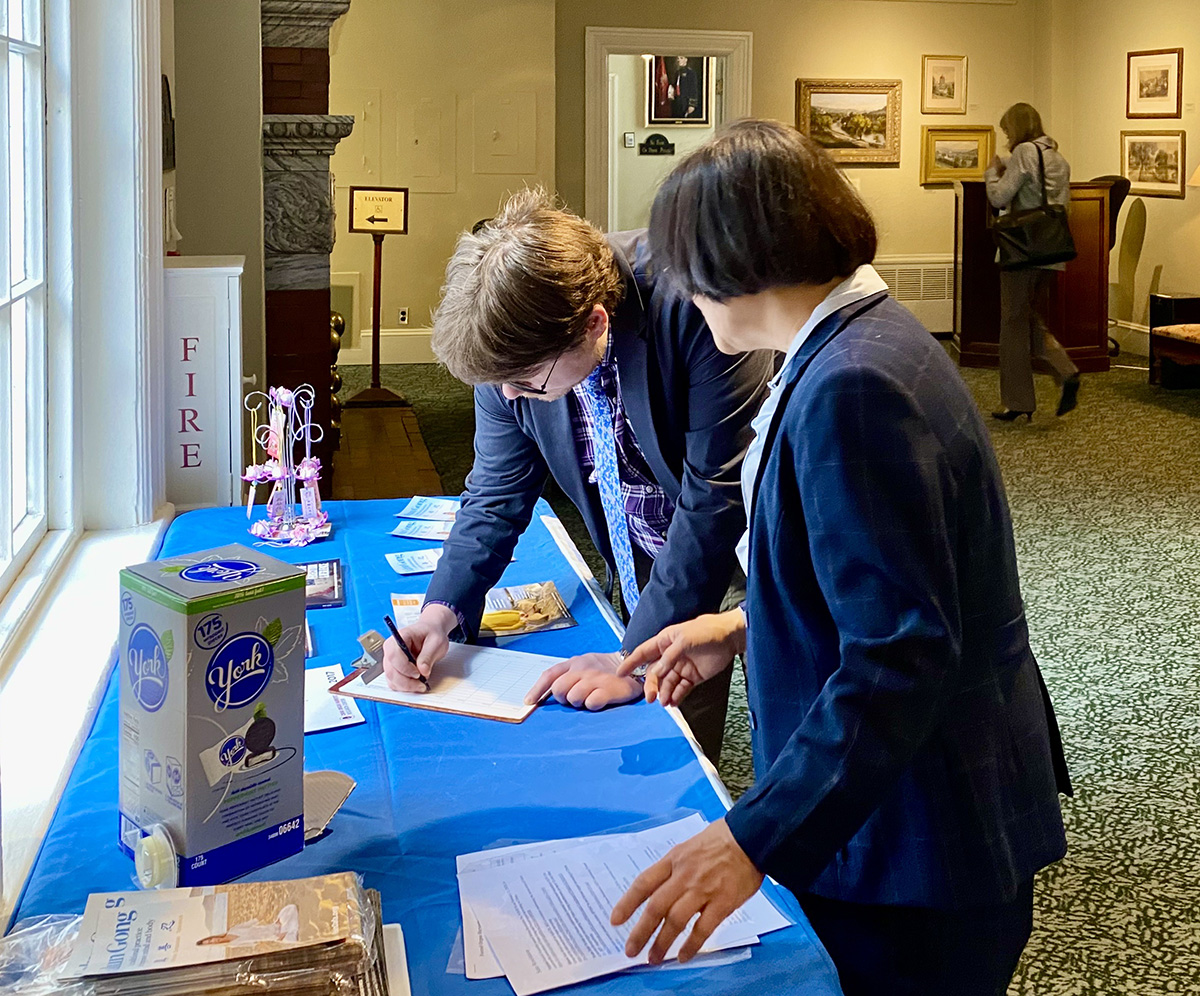 ![]() 图1:二零二三年四月十二日,佛蒙特法轮功学员在蒙彼利埃市(Montpelier)的州政府大楼内,设立展位,向大楼内的政府官员和各界人士传播法轮功的真相。佛蒙特州众议员乔纳森·威廉姆斯(穿西装男士)签名支持制止中共活摘器官。 |