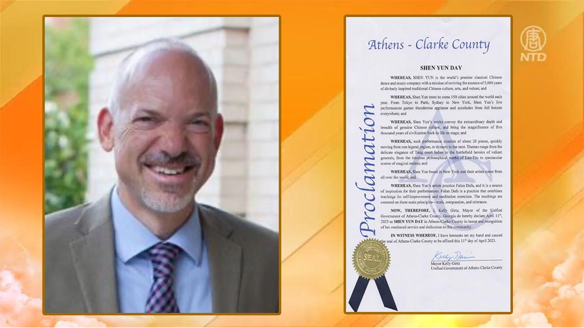 ![]() 图19:美国乔治亚州雅典市与克拉克县联合政府市长凯利‧格慈(Kelly Girtz)发来褒奖。(新唐人合成) |