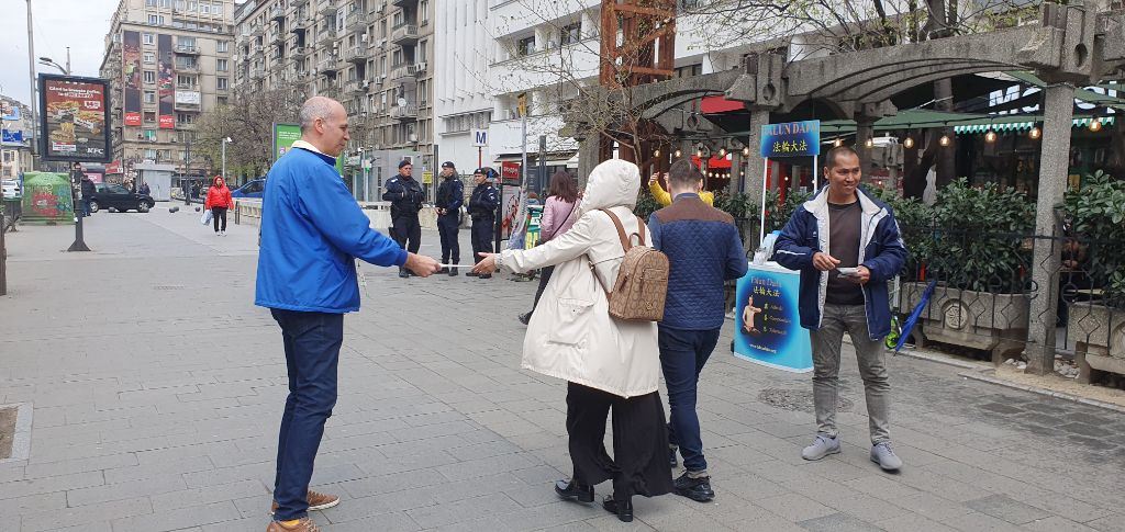 图1:二零二三年四月八日,罗马尼亚布加勒斯特的戈尔日(Gorj)广场的法轮功展位。三位学员在演示功法,一位学员向路人介绍大法修炼的详细情况,另一位学员在发放传单。