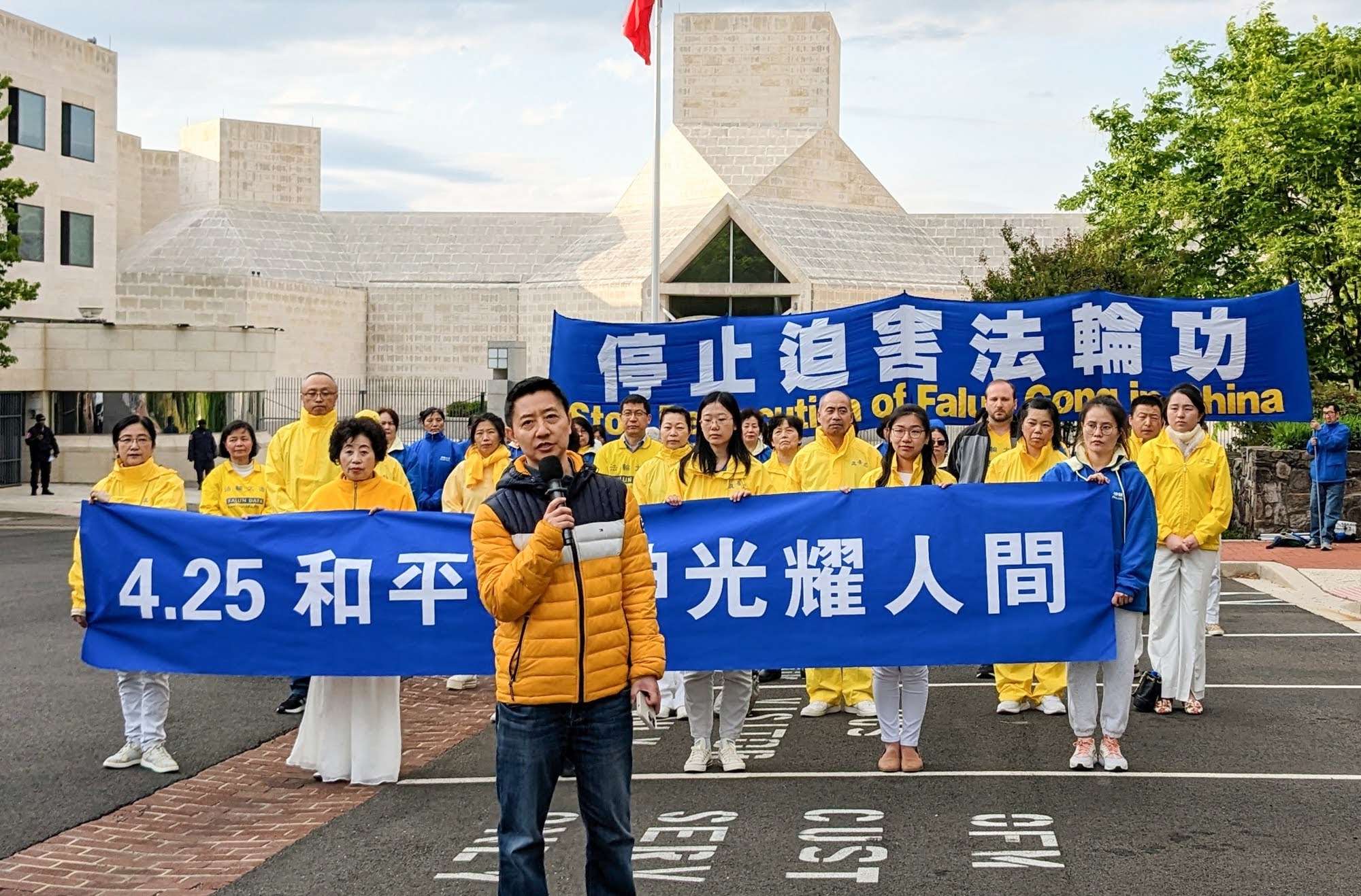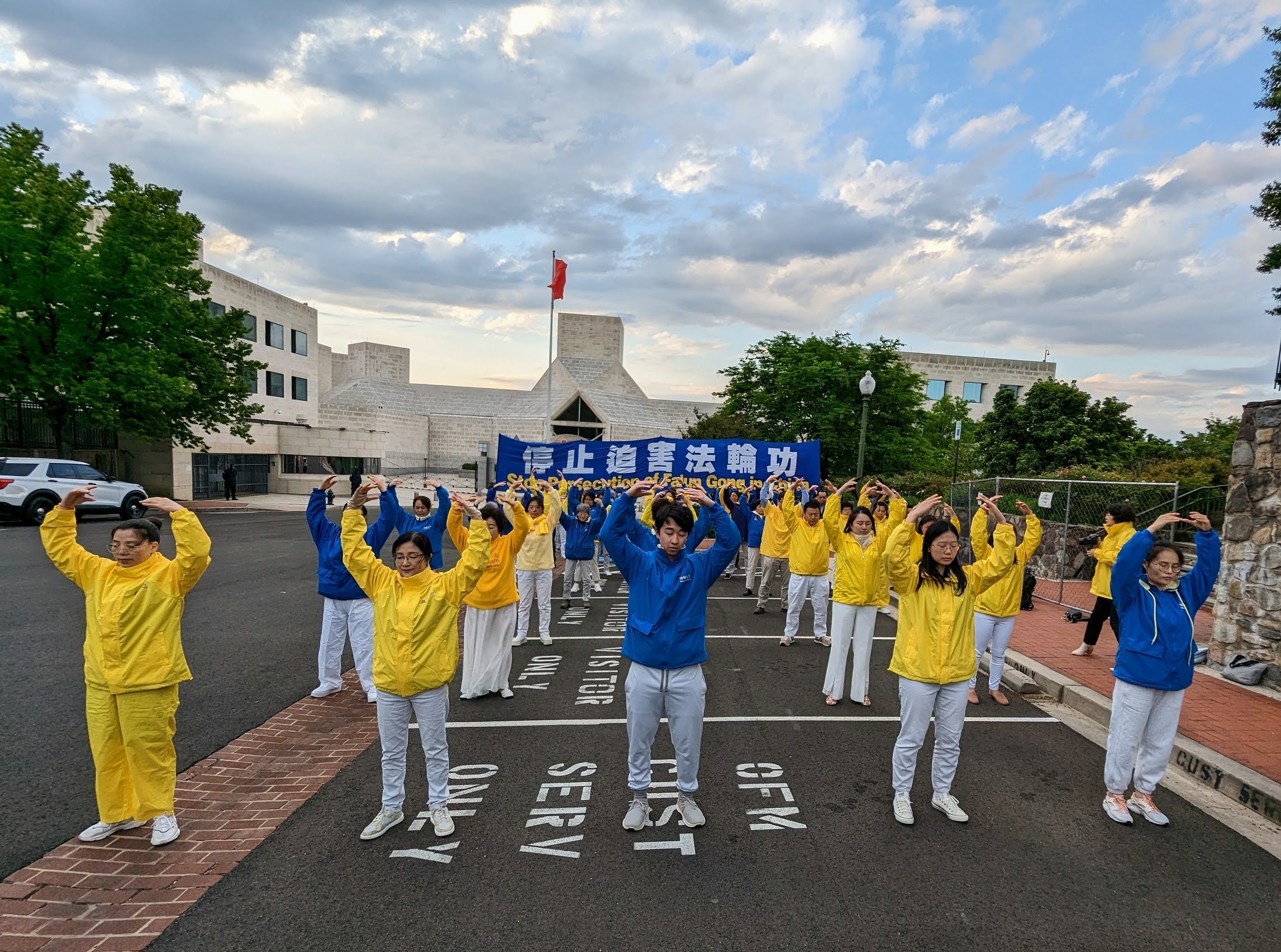 ![]() 图1:二零二三年四月二十三日傍晚,美国首都华盛顿地区部分法轮功学员在中共驻美国大使馆前集会,纪念“四·二五”和平上访二十四周年,呼吁停止迫害法轮功。 |