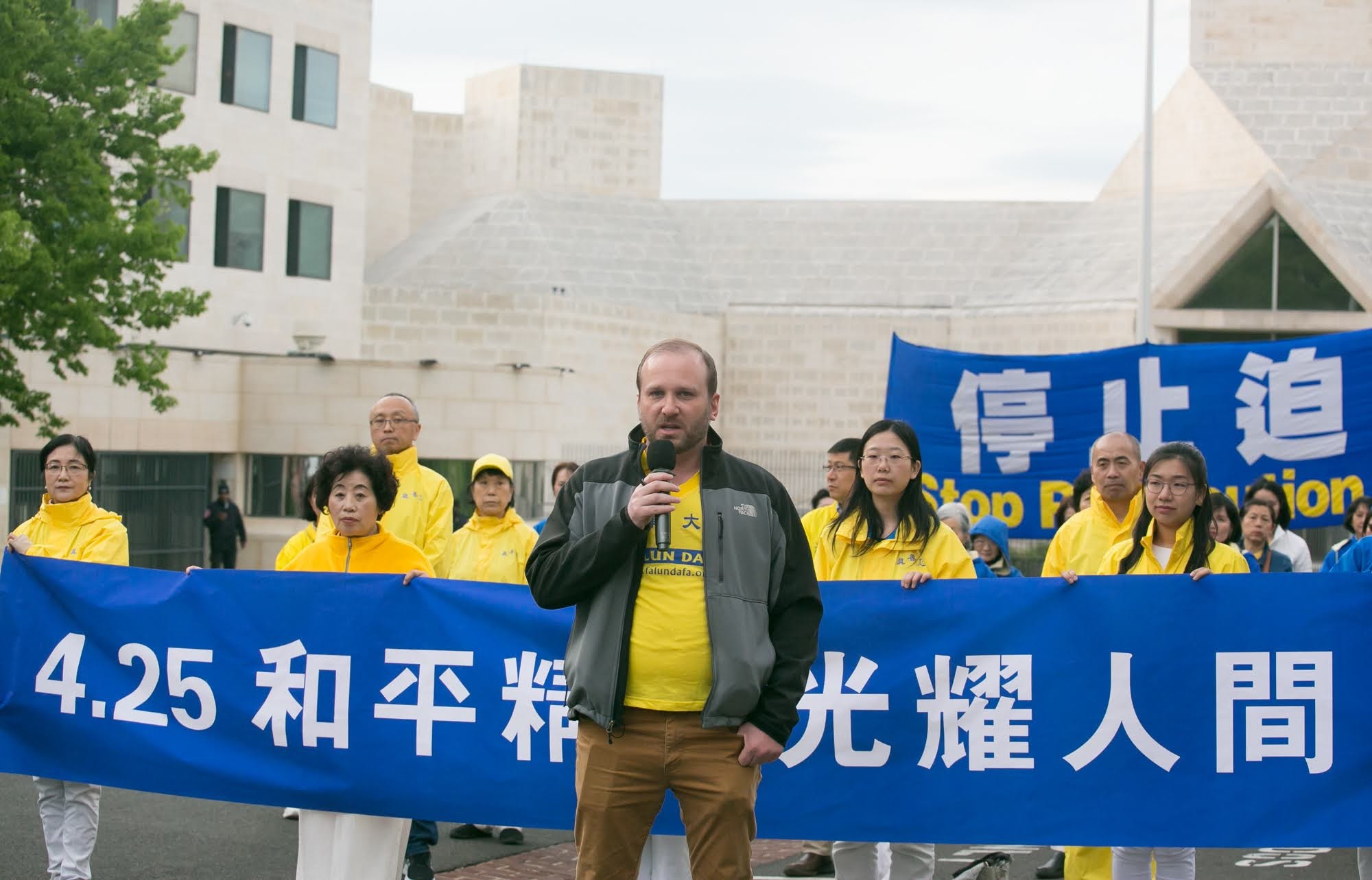 中国问题专家贺斌在集会上说:“每年我们都要来纪念‘四·二五’上访,随着时间的推移,法轮功学员在‘四·二五’上访中争取信仰自由的诉求,展现的勇气,越来越与普通的中国老百姓,甚至全世界的人都息息相关了。”