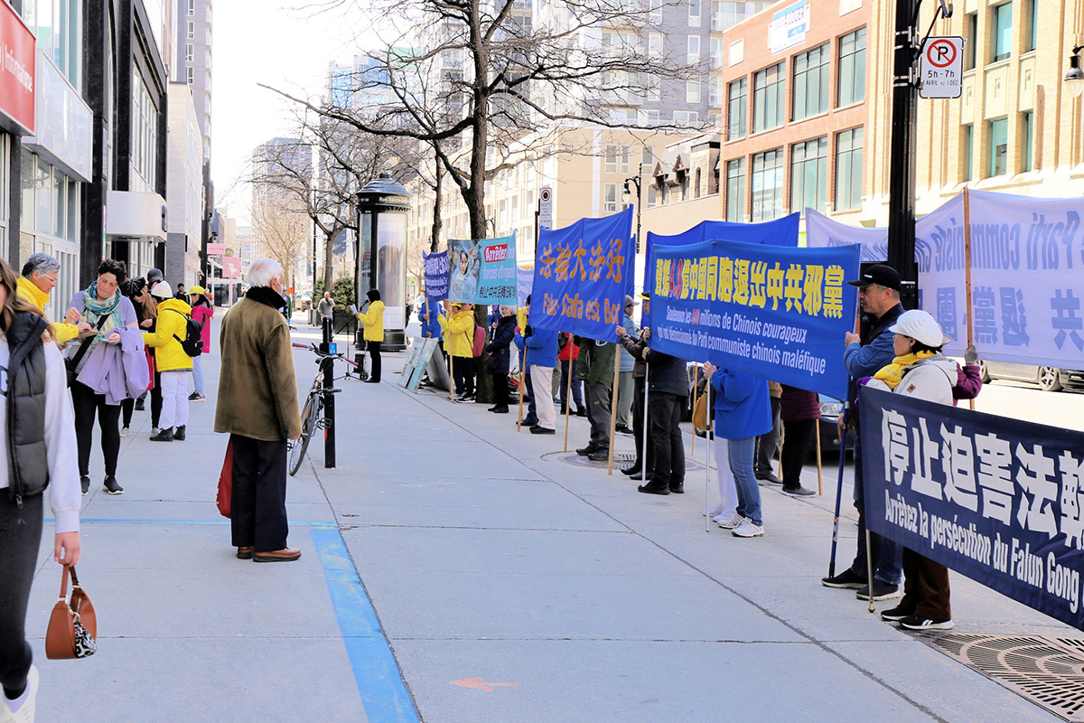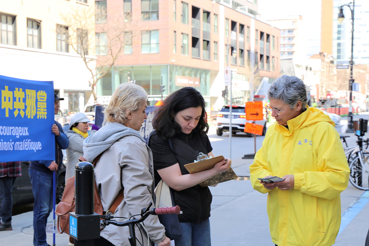 图4~5:四月二十五日,蒙特利尔部份法轮功学员在中领馆前纪念4.25和平上访24周年,并要求中共停止迫害。图为民众在反迫害征签信上签名。