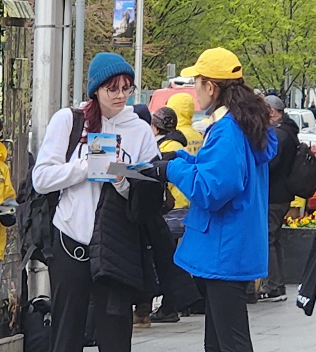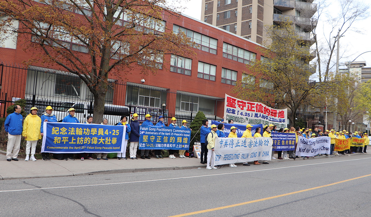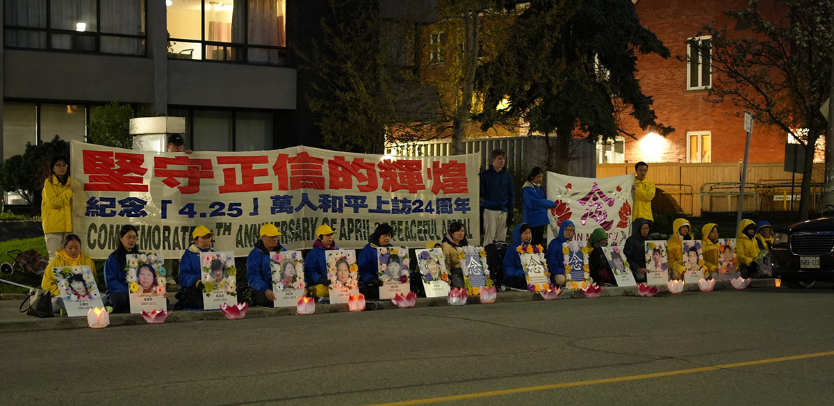 当天上午十一点法轮功学员在中领馆前举行了集会,中午三点在市中心的主要十字路口拉横幅和征签,向民众讲述着真相;晚上八点在中领馆前点燃蜡烛,悼念二十四年来遭中共迫害致死的法轮功学员。