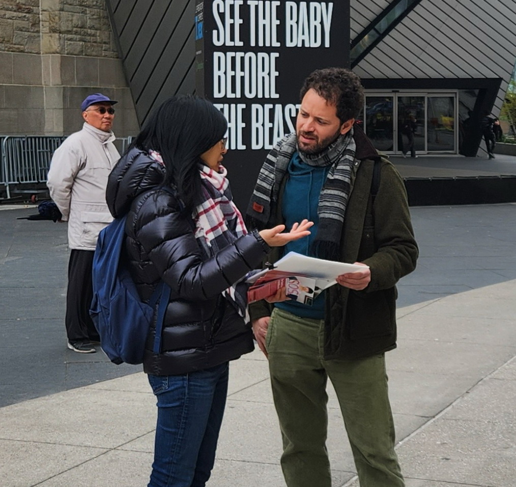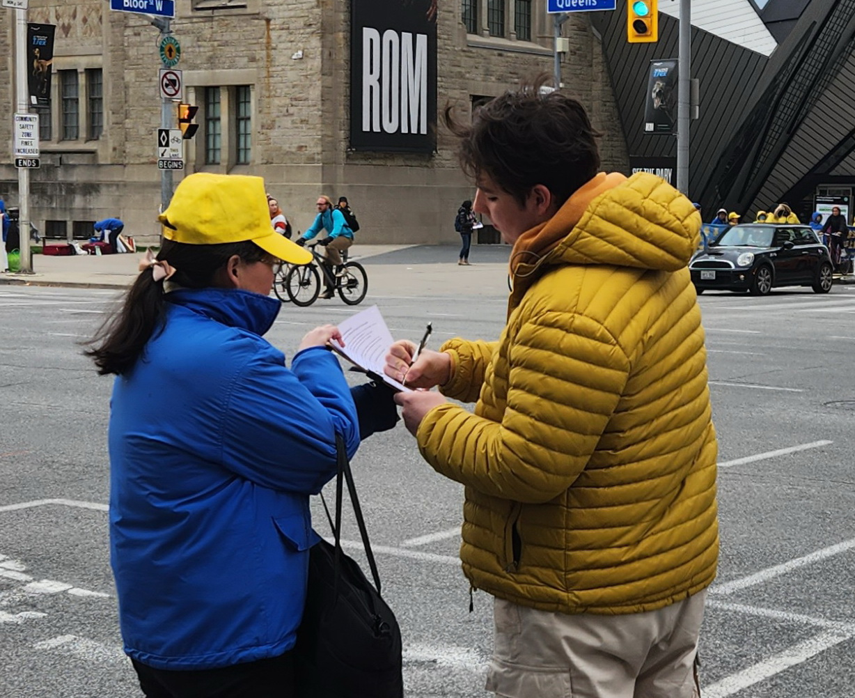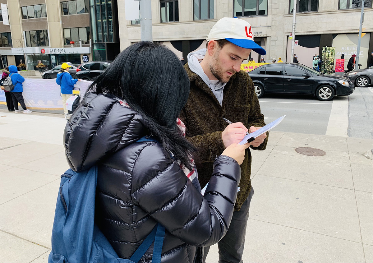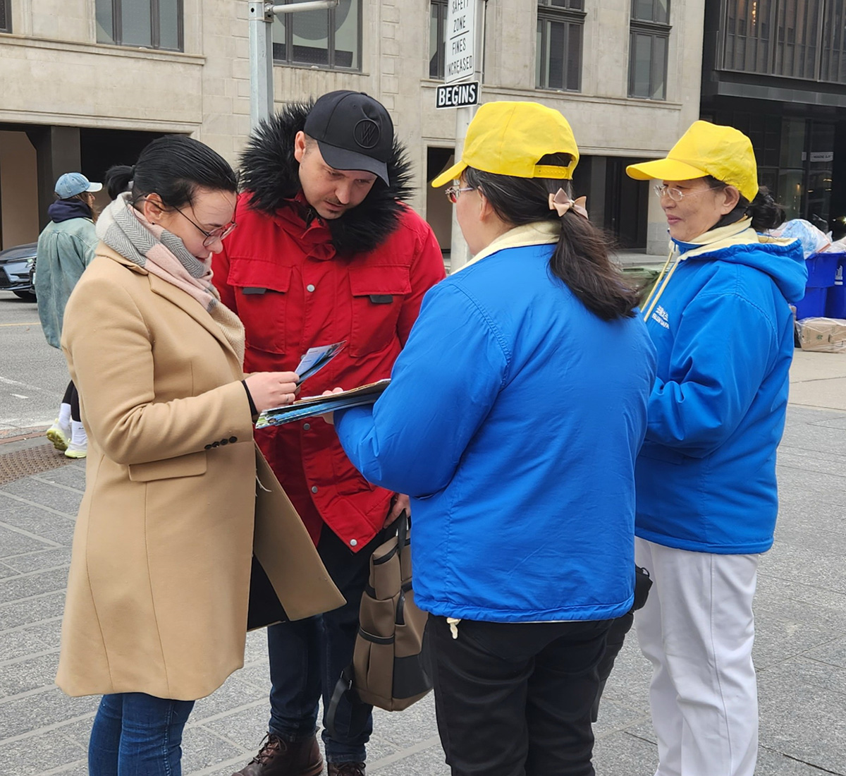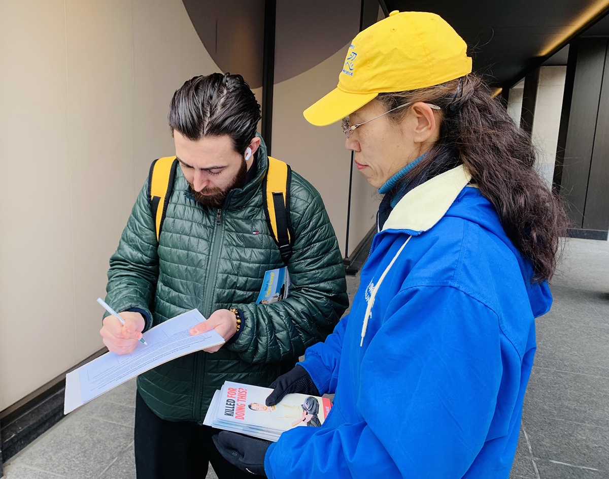 刚从乌克兰出国两个月的内斯特(Nestor)夫妇了解到今天的活动目的和意义后,这对夫妇毫不犹豫地在“停止迫害征签表”上签名。