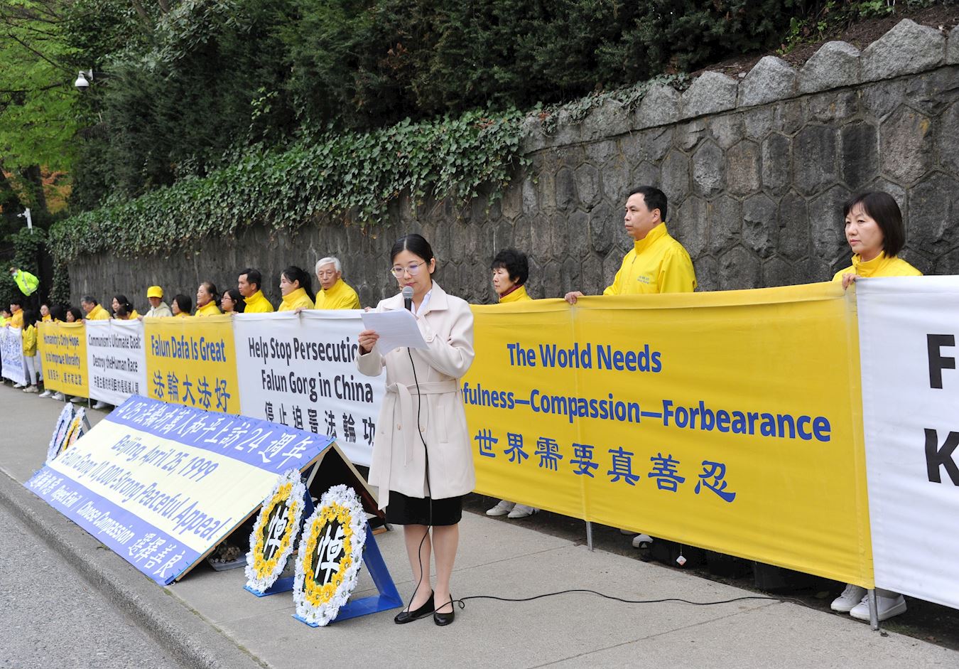 她说:“中共对法轮功的残酷迫害已经持续了二十四年。今天,加拿大各地的法轮功学员,在中领馆前举行守夜和集会来纪念四·二五这个历史事件,纪念中国法轮功学员维护信仰自由的勇气。”