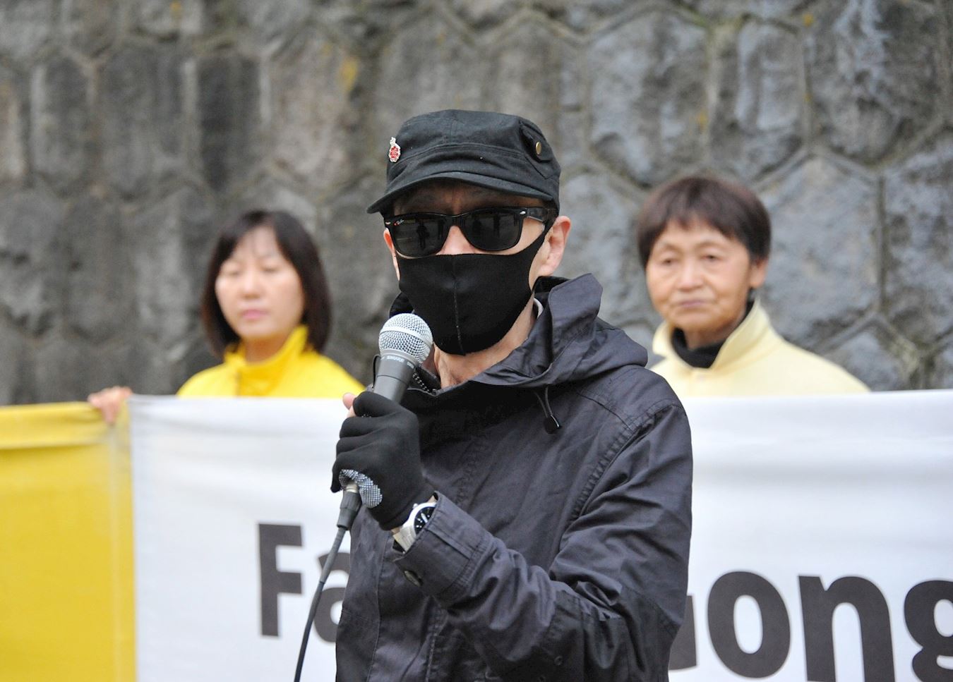 ![]() 图7:香港移民John在集会上发言说:“希望法轮功能够坚持下去,播撒这个(善的)种子给每一个人” |