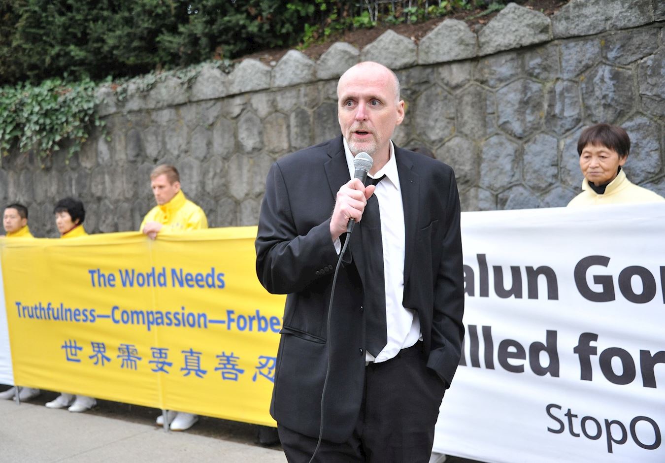 温哥华知名博主沃特森(Dennis Watson)也来到现场,并在集会上发言说:“他们(CCP)说的那些都是谎言。法轮功是非常积极、和平的,他们信奉的是真与诚实,而且是非暴力的。”