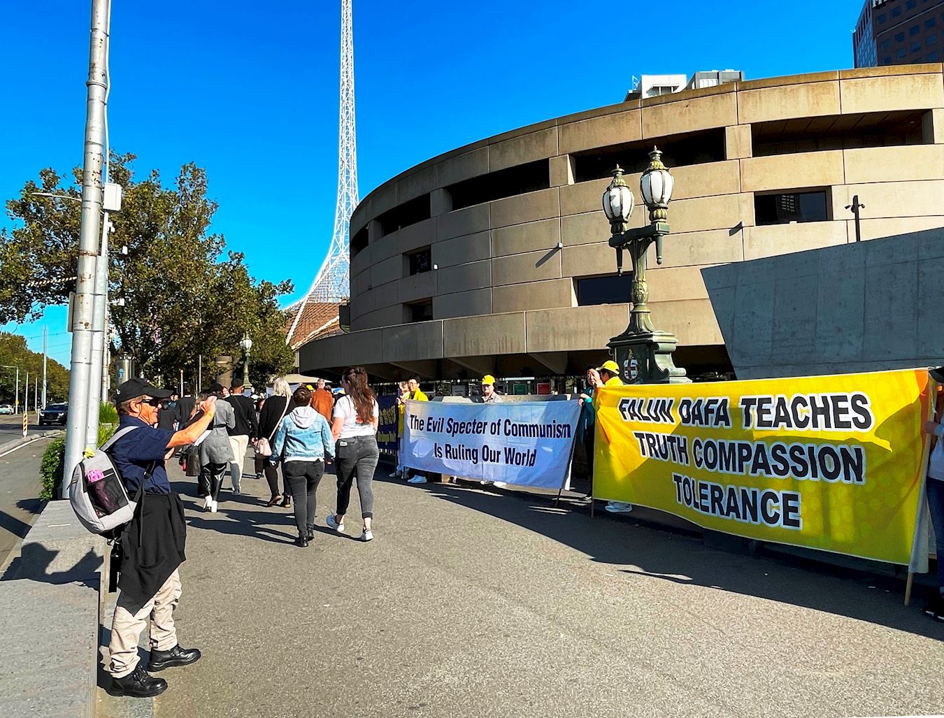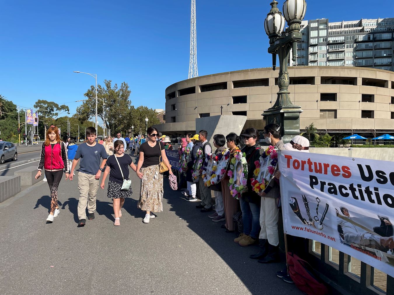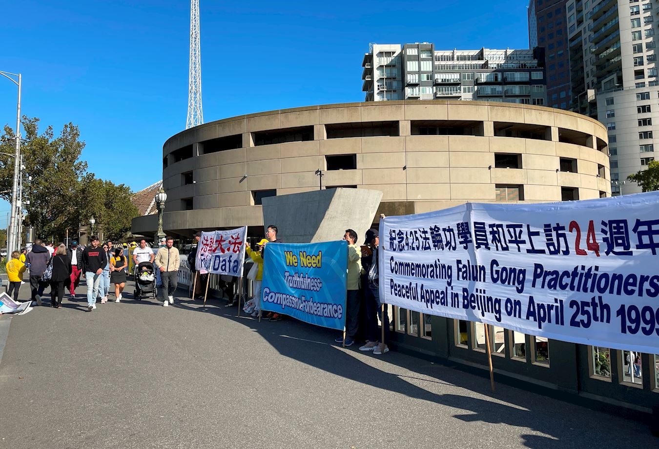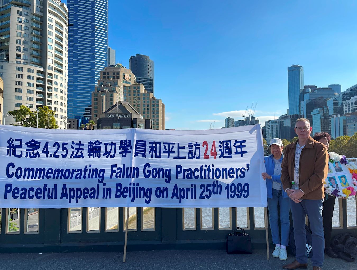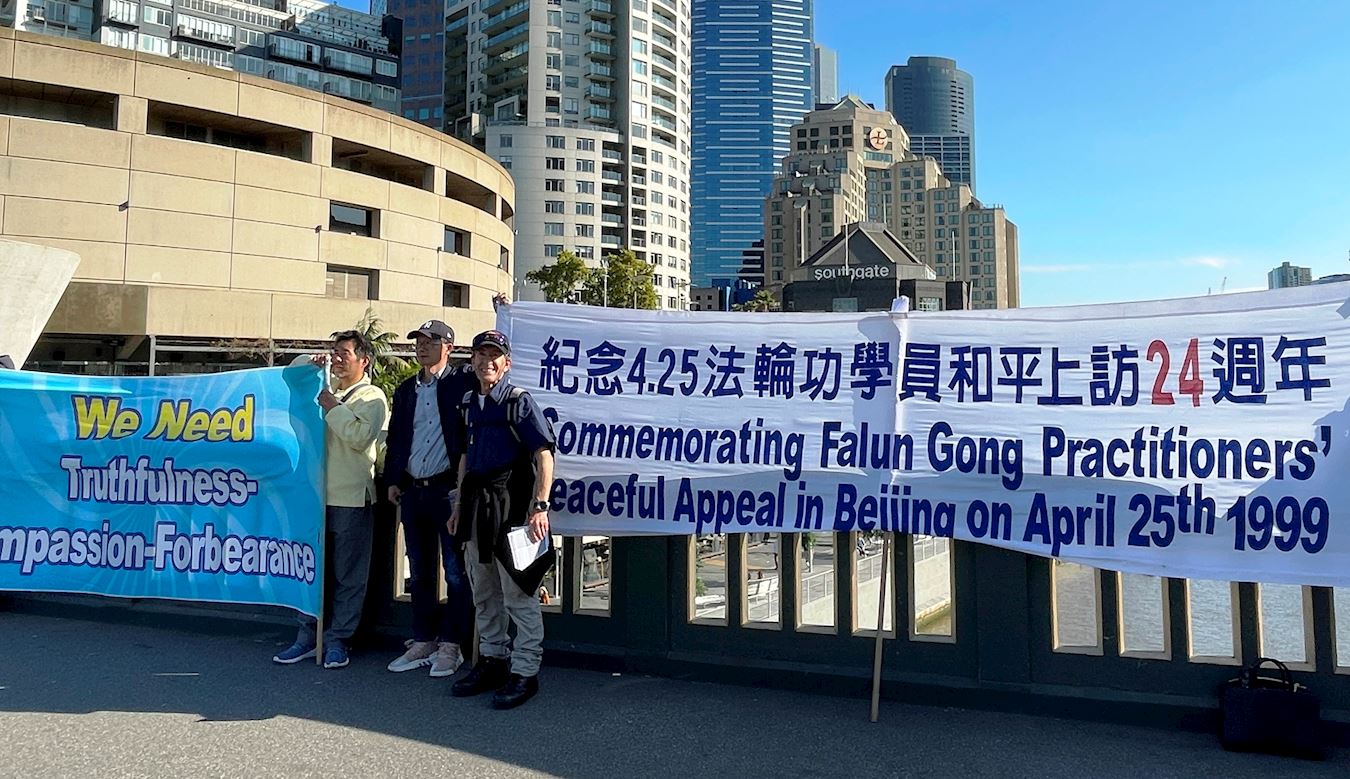 “四·二五”万人和平上访二十四周年之际,在王子桥的一侧,墨尔本部分法轮功学员展开十余条真相横幅,默默地讲述着在持续二十四年的中共血腥迫害下,海内外法轮功学员秉持“四·二五”精神,慈悲理性传递大法美好、揭露中共迫害真相的故事。