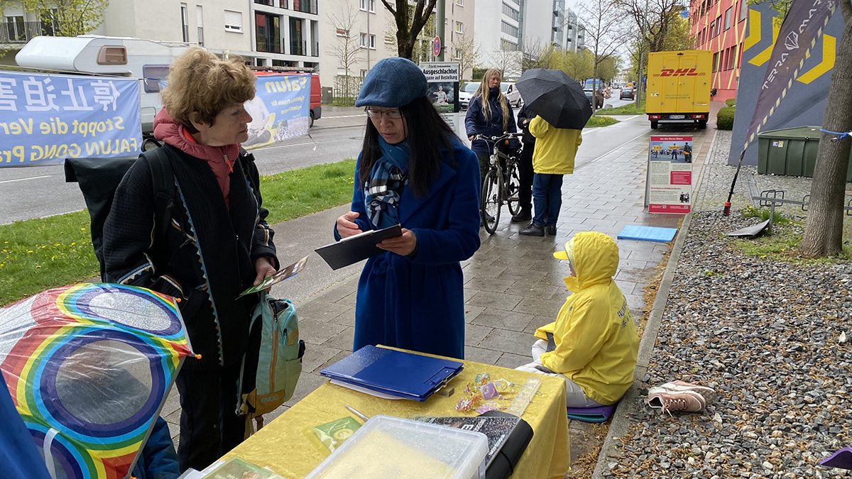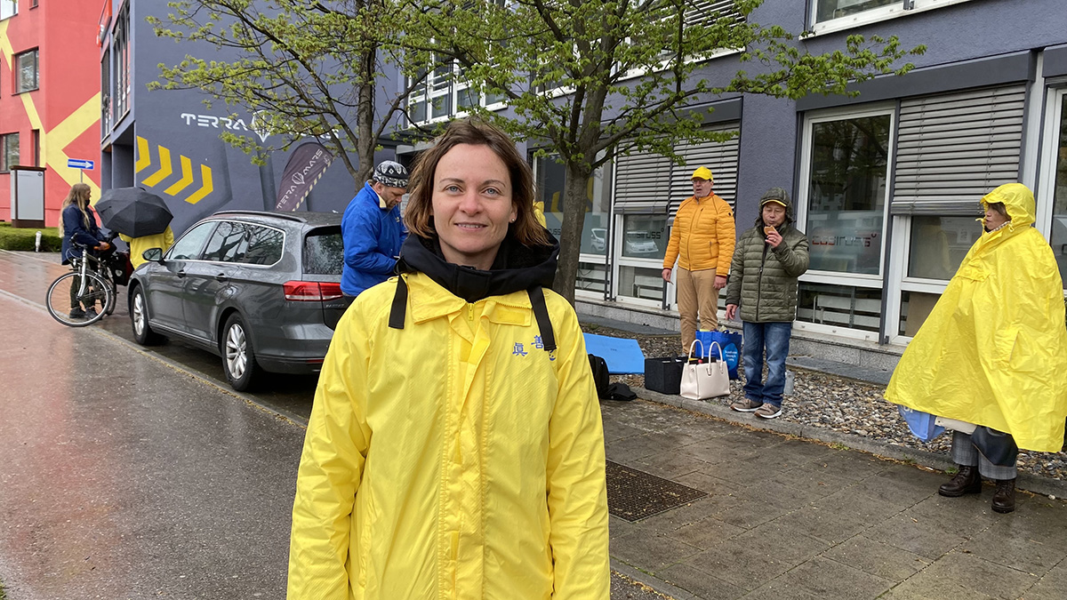 在慕尼黑参加活动的罗马尼亚法轮功学员伊莉娜(Irina)是一名舞蹈演员,目前住在纽伦堡。她表示中国法轮功学员没法公开纪念四·二五,“今天是重要的日子。我想代表这些修炼者(大陆学员)发声。”