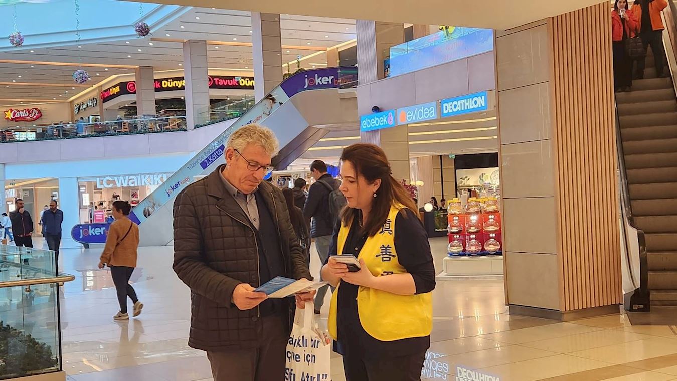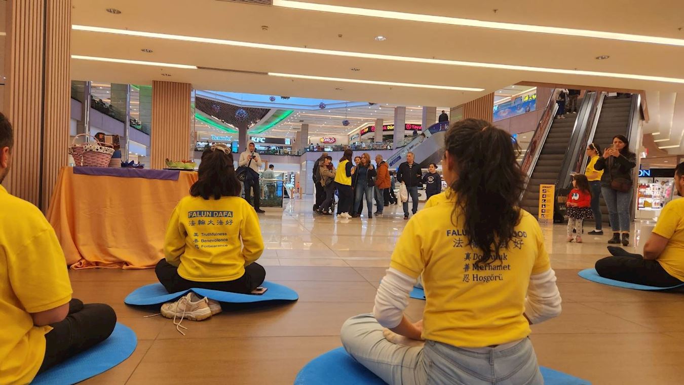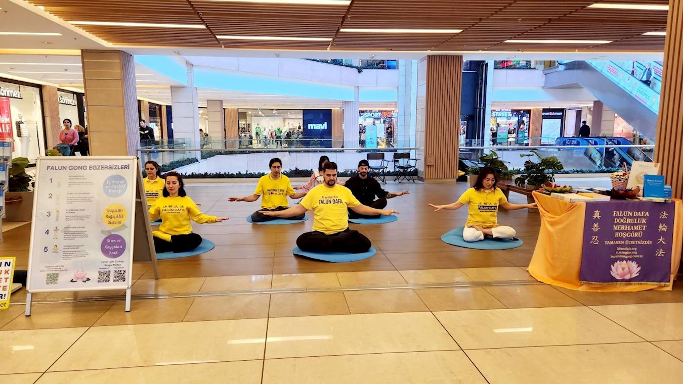 ![]() 图1:二零二三年三月二十五日,土耳其法轮功学员们在伊斯坦布尔亚洲区最受欢迎的购物中心之一Tepe Natulis Avm,弘法并做功法演示。 |