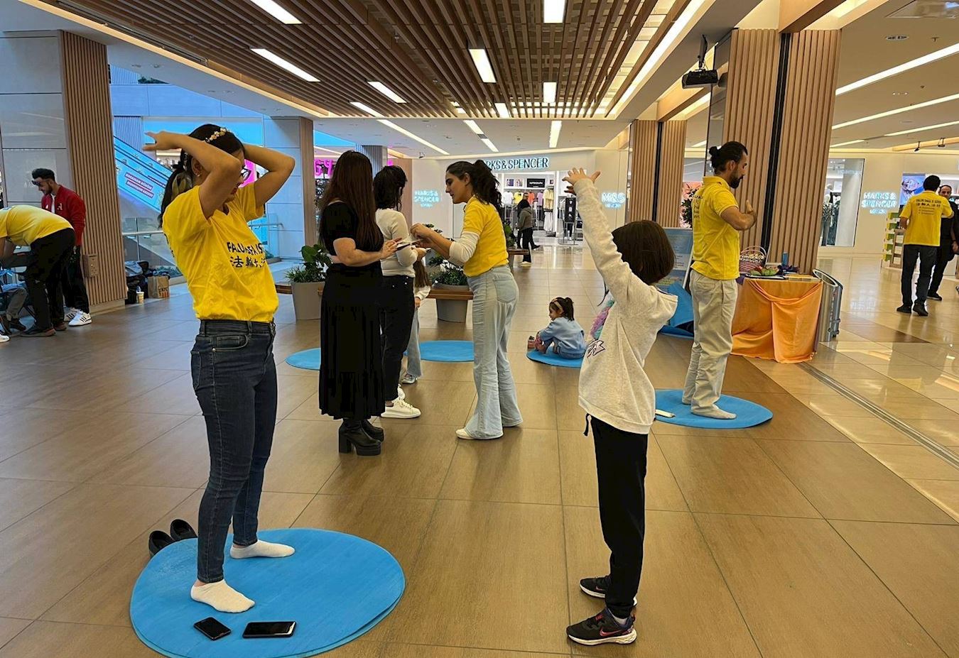活动开始后,购物中心的游客们,有的长时间坐在长椅上观看学员演示功法,有的索取大法宣传册,有的与法轮功学员们交谈,了解法轮大法。