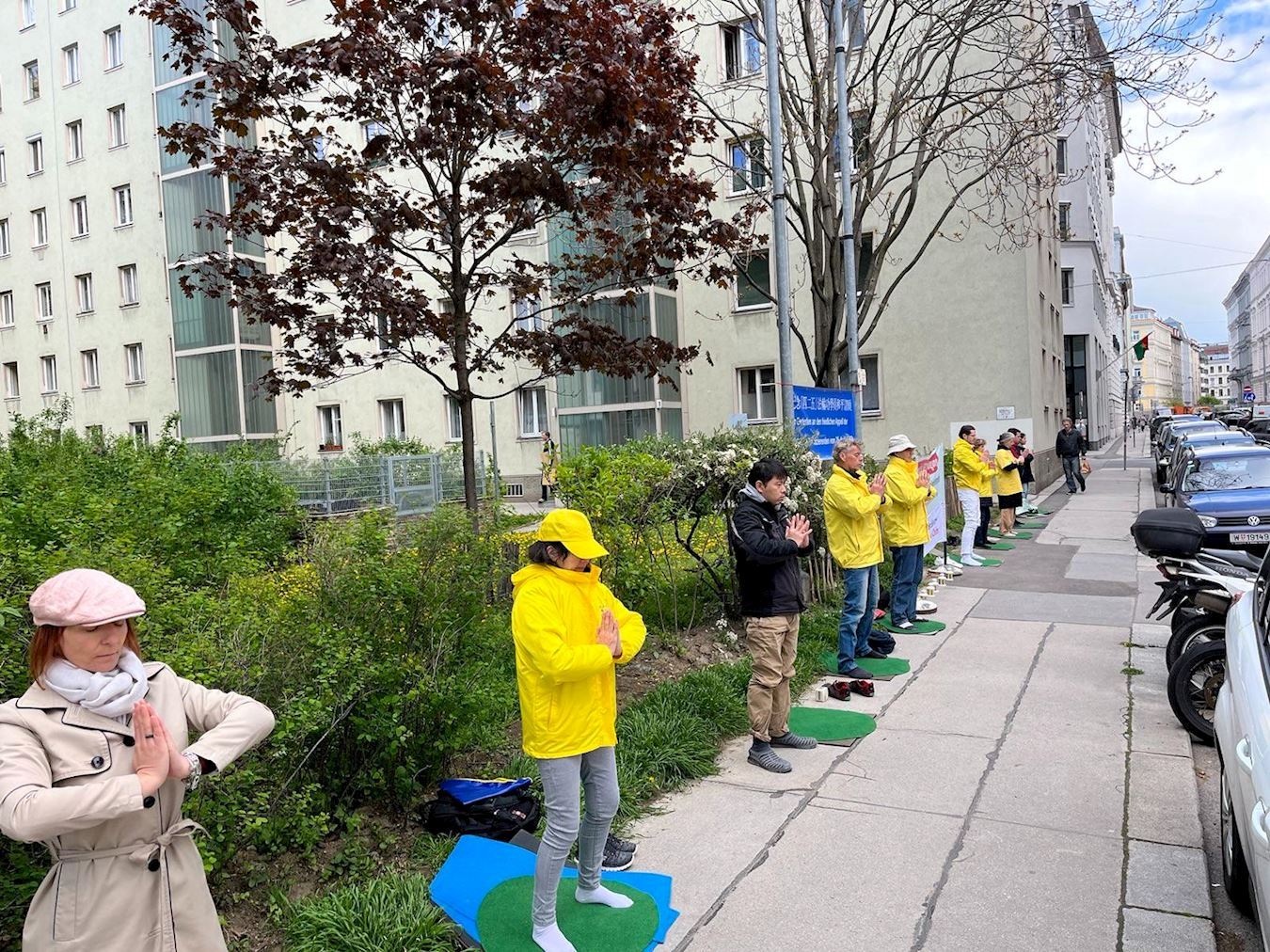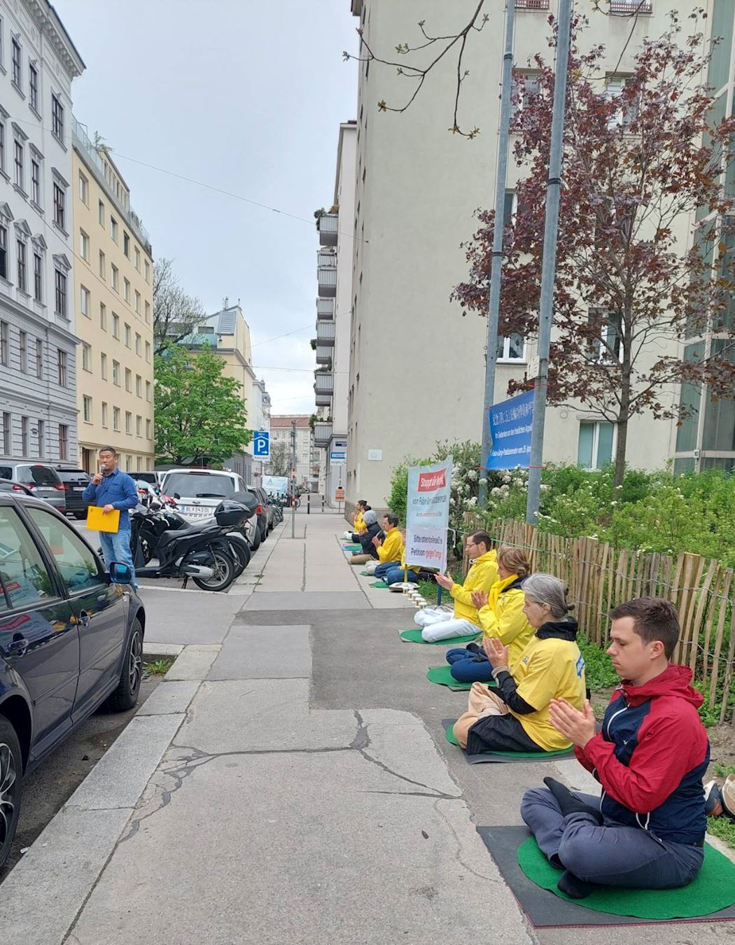 ![]() 图1:奥地利法轮大法学会发言人发言,法轮功学员在旁打坐声援 |