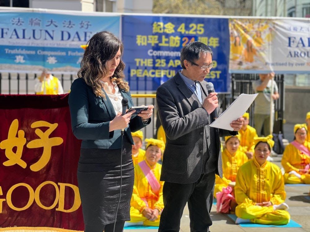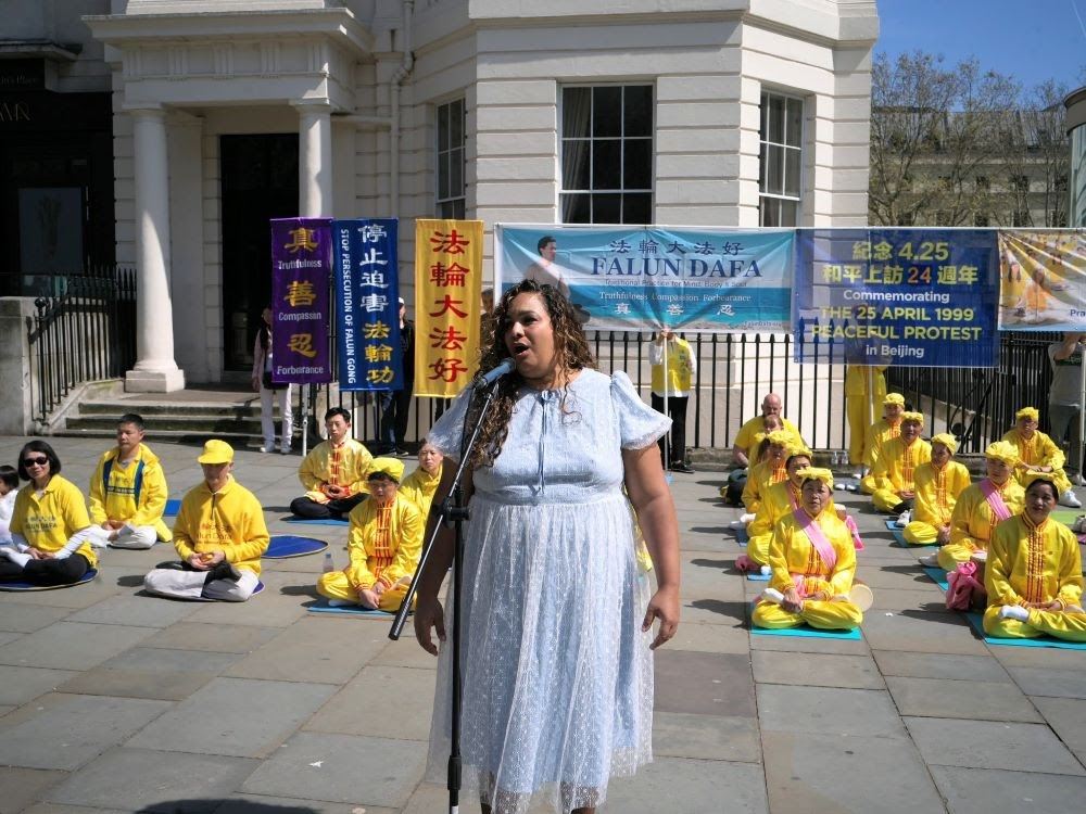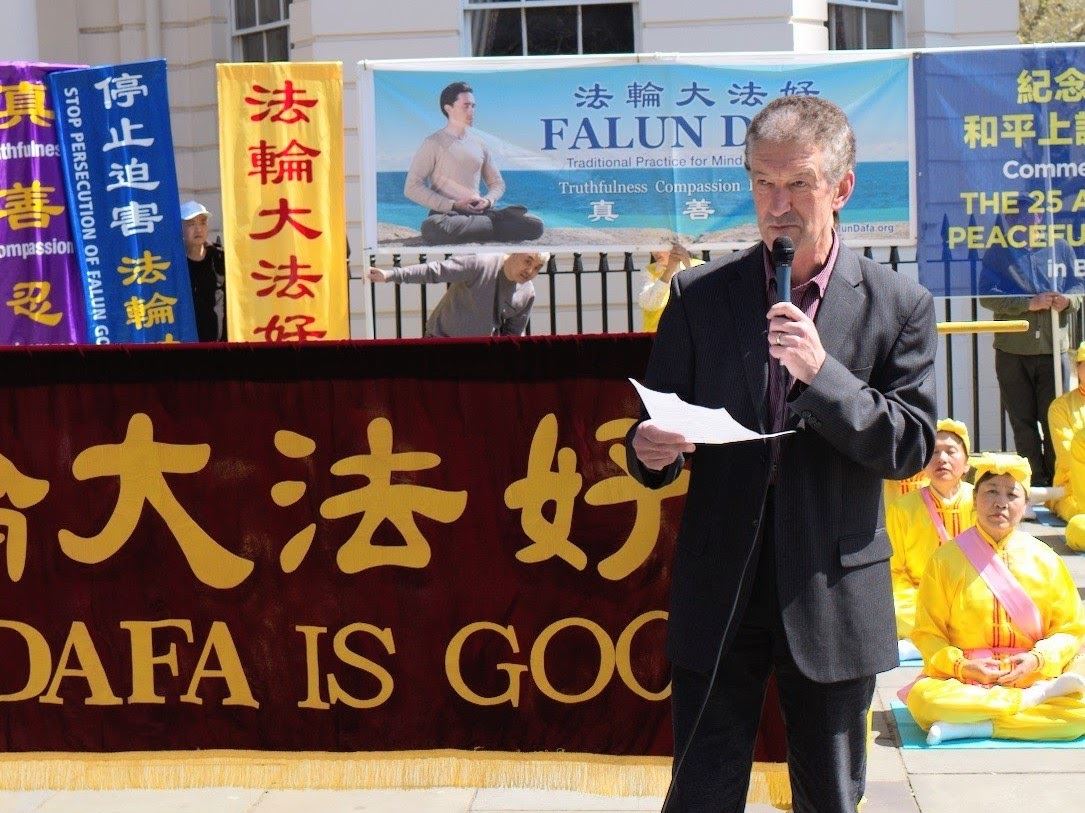 欧洲法轮功之友主席约翰·迪伊(John Dee)在发言中表示:“四月二十五日,是我们纪念万名法轮功学员在二十四年前聚集在北京附近的中南海,向中国政府请愿,要求释放之前在天津被拘留的一群法轮功学员的日子。这些学员并没有追求政治权力,只是想要回普通中国公民的言论自由和表达自由。”