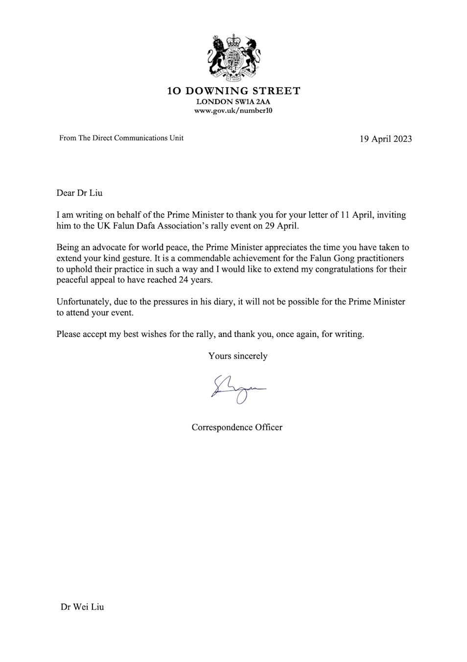 在本次活动开始前,英国首相府发来信函,表达首相里希•苏纳克(Rishi Sunak)对法轮功学员的支持。